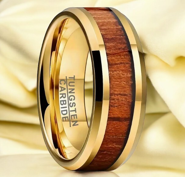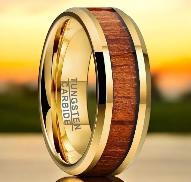 - Tungsten Wood & Gold Wedding Band | Men’s Durable Ring | Retro Stylish Design
