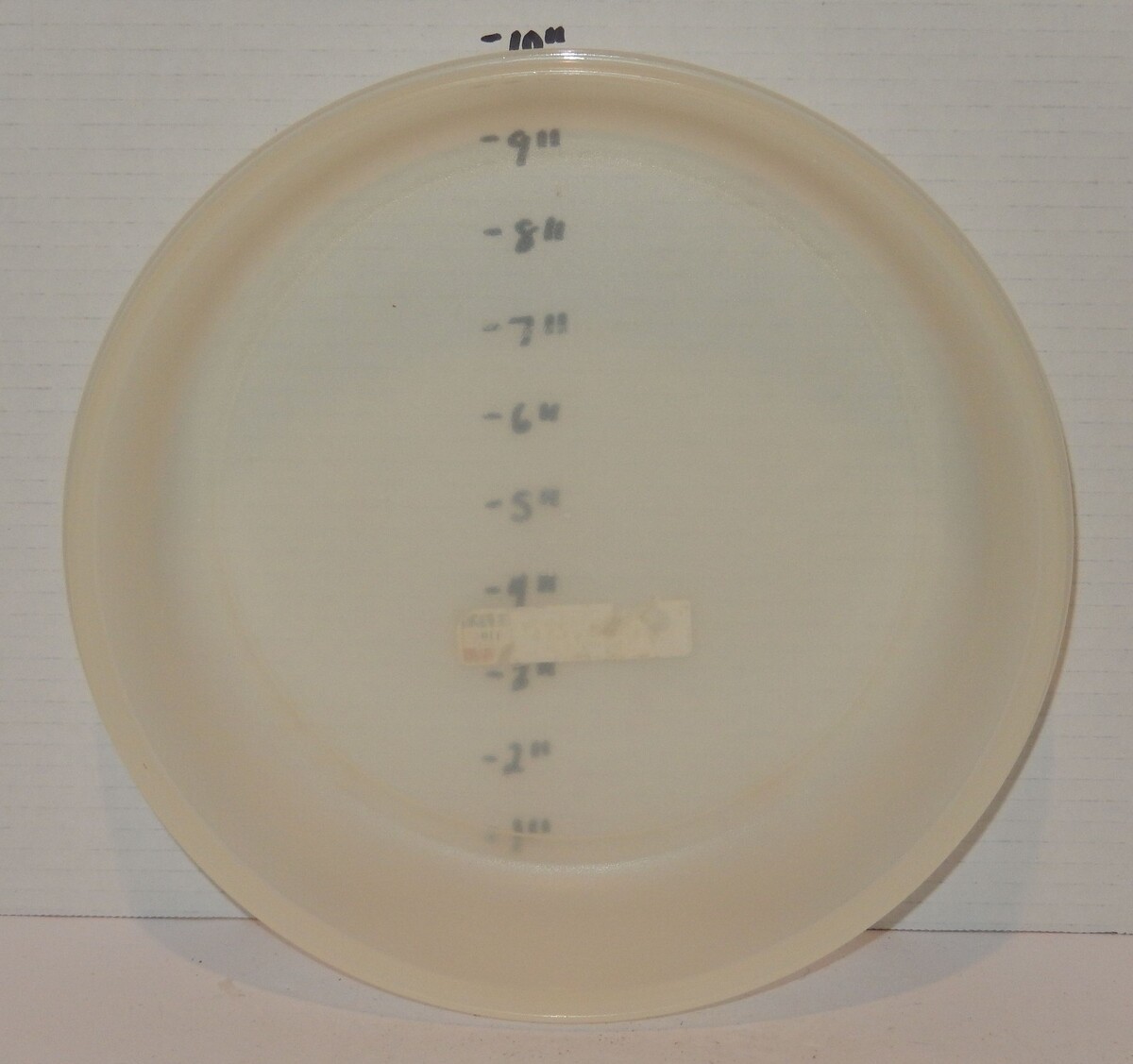 This is a pre-owned, vintage item in good, functional condition. It shows normal signs of a well-loved kitchen item, including some light surface scratches and scuffs from decades of use and storage. The sheer plastic has some minor, even age-related yellowing, which is common for these vintage pieces. There are no cracks, chips, or splits in the plastic.
