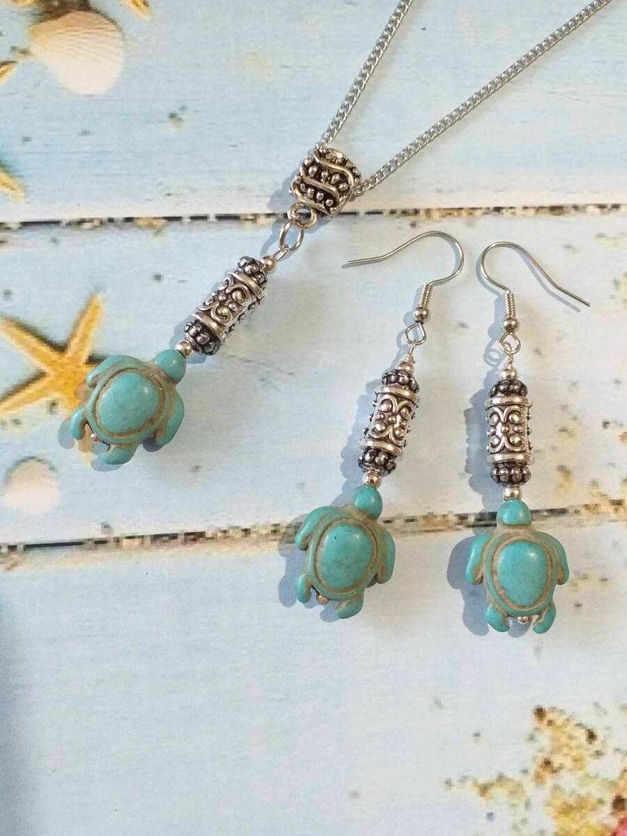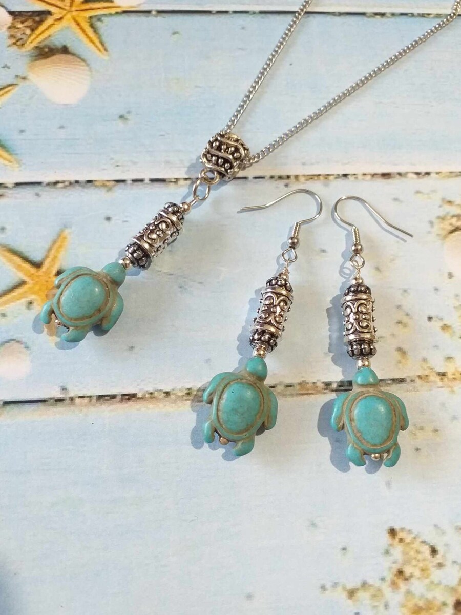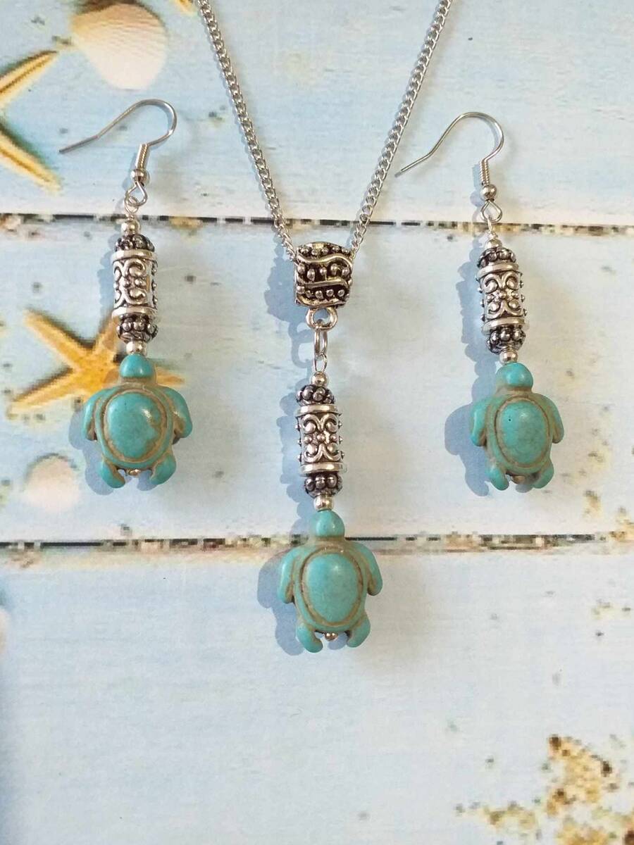 Turquoise carved Sea Turtle jewelry set necklace and earrings. Bohemian necklace and earrings .