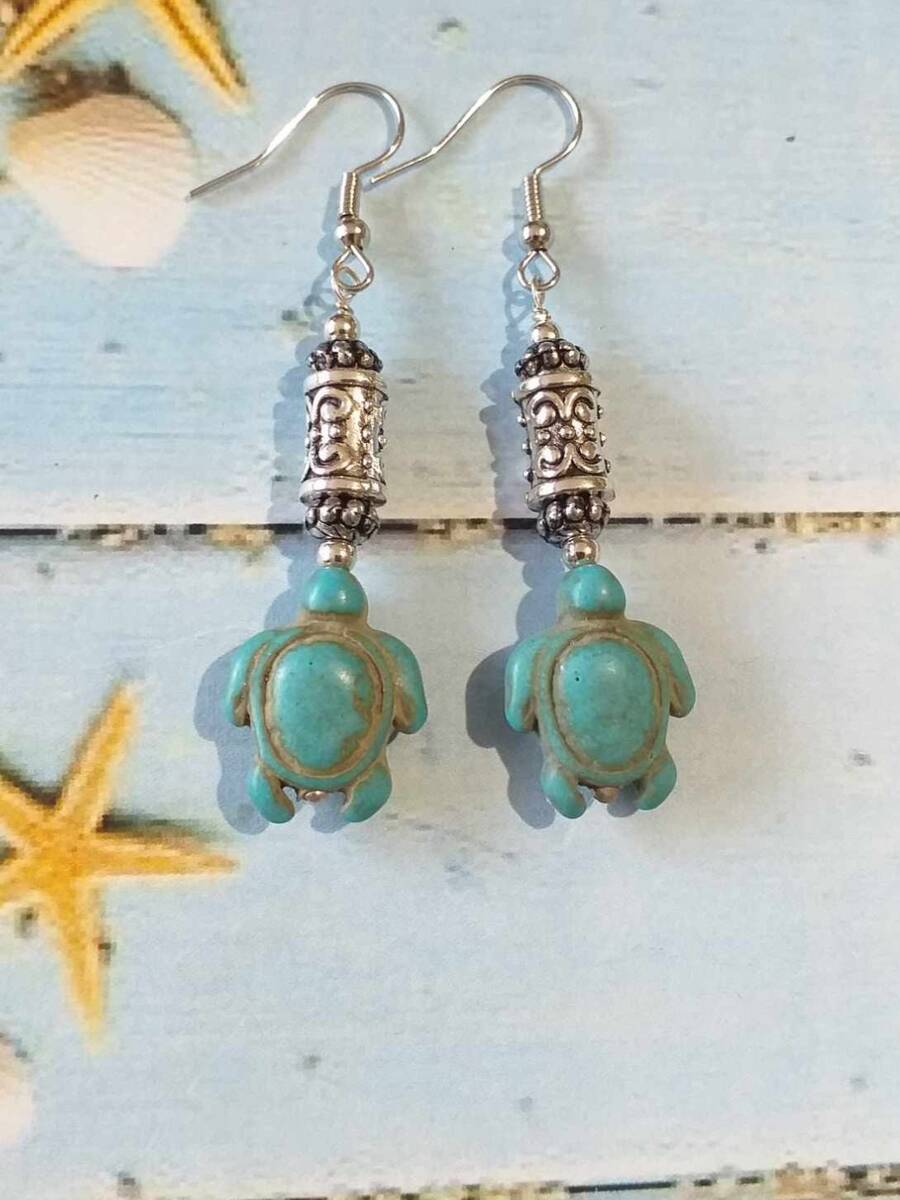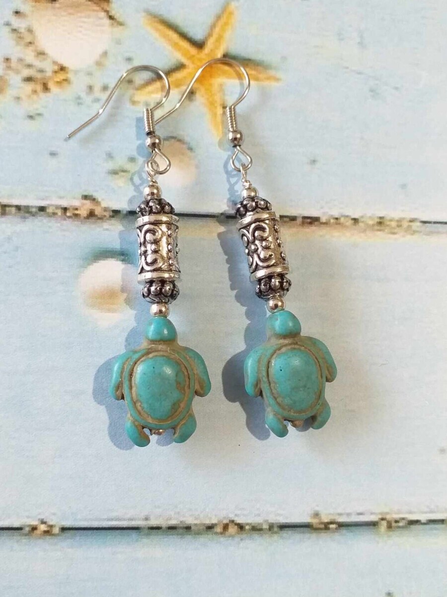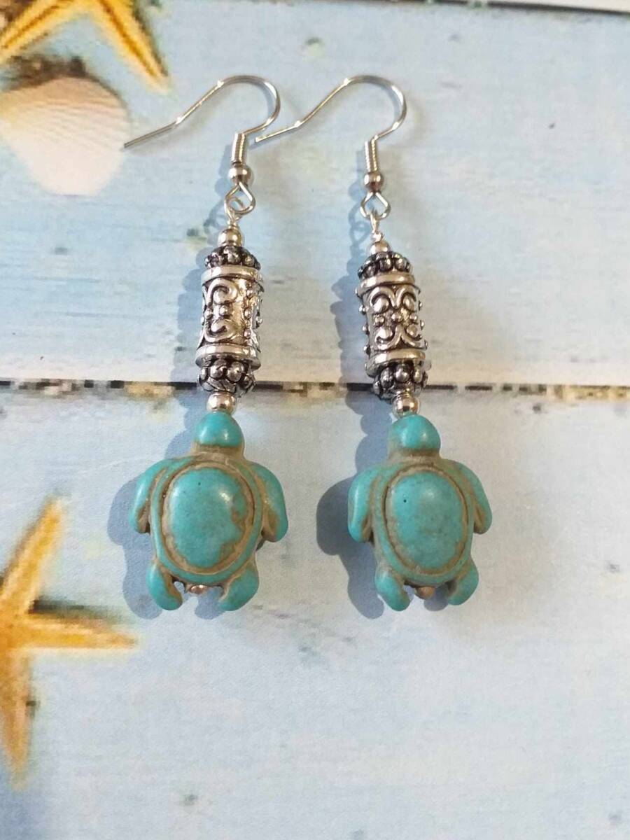 Turquoise carved Sea Turtle jewelry set necklace and earrings. Bohemian necklace and earrings .