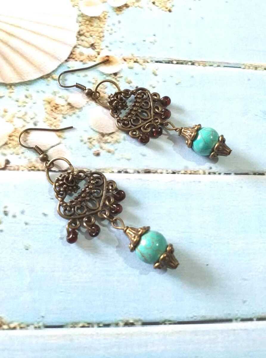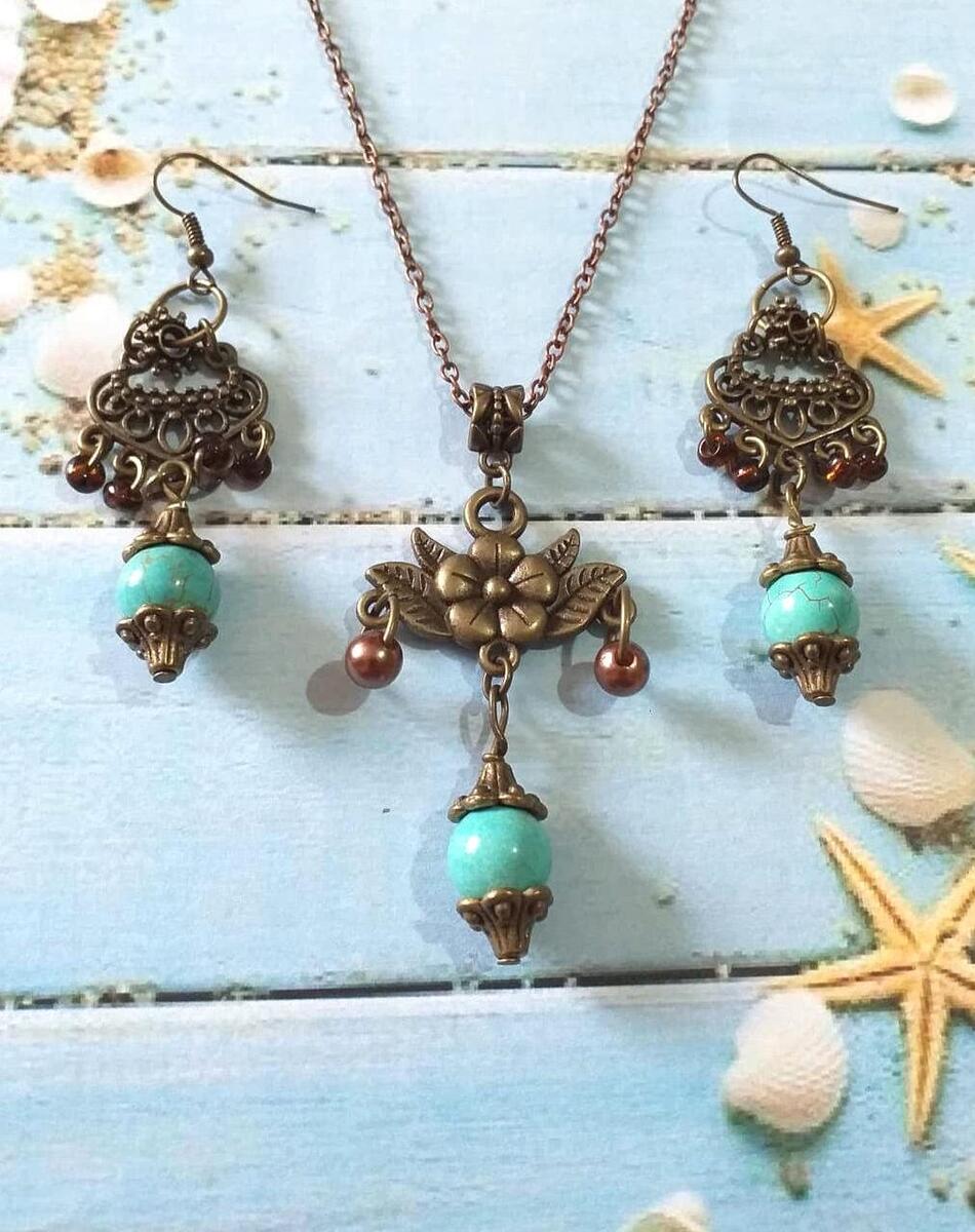 Beautiful bronze Victorian style Turquoise jewelry set pendant necklace and earrings. Antique style Turquoise bronze tone pendant necklace with same style turquoise earrings . Boho necklace . Boho earrings. Bohemian necklace . Bohemian earrings . Romantic style necklace and earrings jewelry set . Baroque style necklace and earrings . Genuine Turquoise beautiful necklace and earrings.