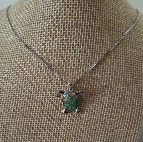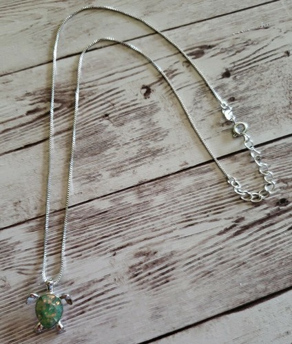 This sale is for one (1) necklace with silver hardware Material ~ Alloy Color of Turtle is Green Opal This necklace hangs approximately 9.25" (when on last hook) approximately 10" long including the turtle Turtle is the symbol of longevity ~ turtles live a long ~ fruitful life teaches great spiritual significance of taking the very best care of self and having a long life filled with journeys having learned many valuable life lessons This necklace is brand new ~ never worn Please view photos for a good description of this necklace Thank you!
