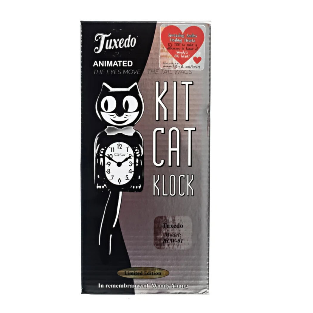 For over a decade, Woody dreamed of making a Tuxedo Kit-Cat Clock and was inspired by his own tradition of wearing a tuxedo to special events as Kit-Cat?s biggest ambassador. Now, in his honor, Kit-Cat is dressing up just like Woody! This special edition clock is more than just a new design: it?s a tribute to the man who saved and grew the Kit-Cat brand for over 40 years. This is also a first in many ways: our first-ever inverted belly print, first Warm White painted smile, first chrome bow tie, and first time using a metallic finish on our retro anniversary box. But most importantly, it?s the first Kit-Cat to give back to heart saving relief efforts. With every Tuxedo Kit-Cat sold, $1 is donated to the Childrens Heart Project, an organization that provides life-saving heart surgeries to children in need.