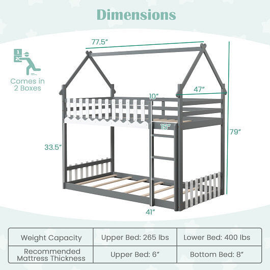 Specifications: Color Gray/White Material Pine Wood Plywood MDF Overall Dimensions 77.5" x 47" x 79" Height Between Beds 33.5" Height of Guardrails 10" Dimensions of Ladder 15" x 41" Recommended Mattress Thickness of Upper Bed 6" Recommended Mattress Thickness of Bottom Bed 8" Net Weight 109 lbs Weight Capacity of Upper Bed 265 lbs Weight Capacity of Bottom Bed 400 lbs Box Qty 2(May vary by batch)