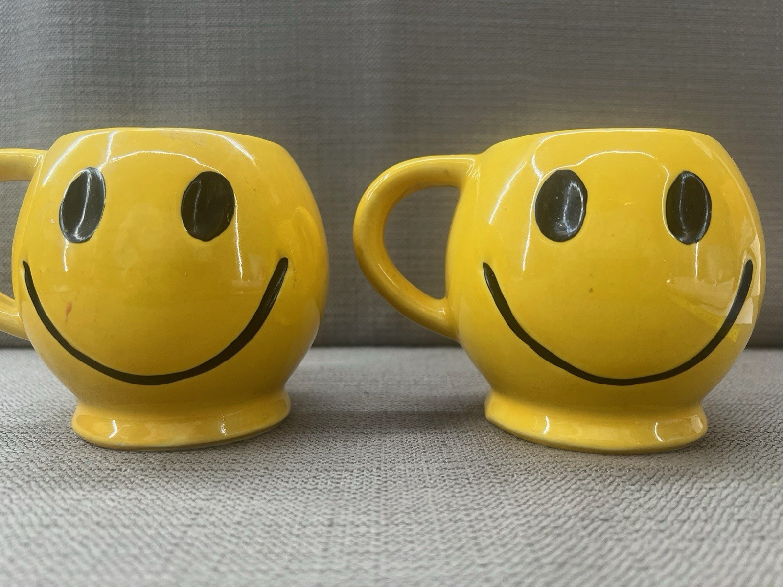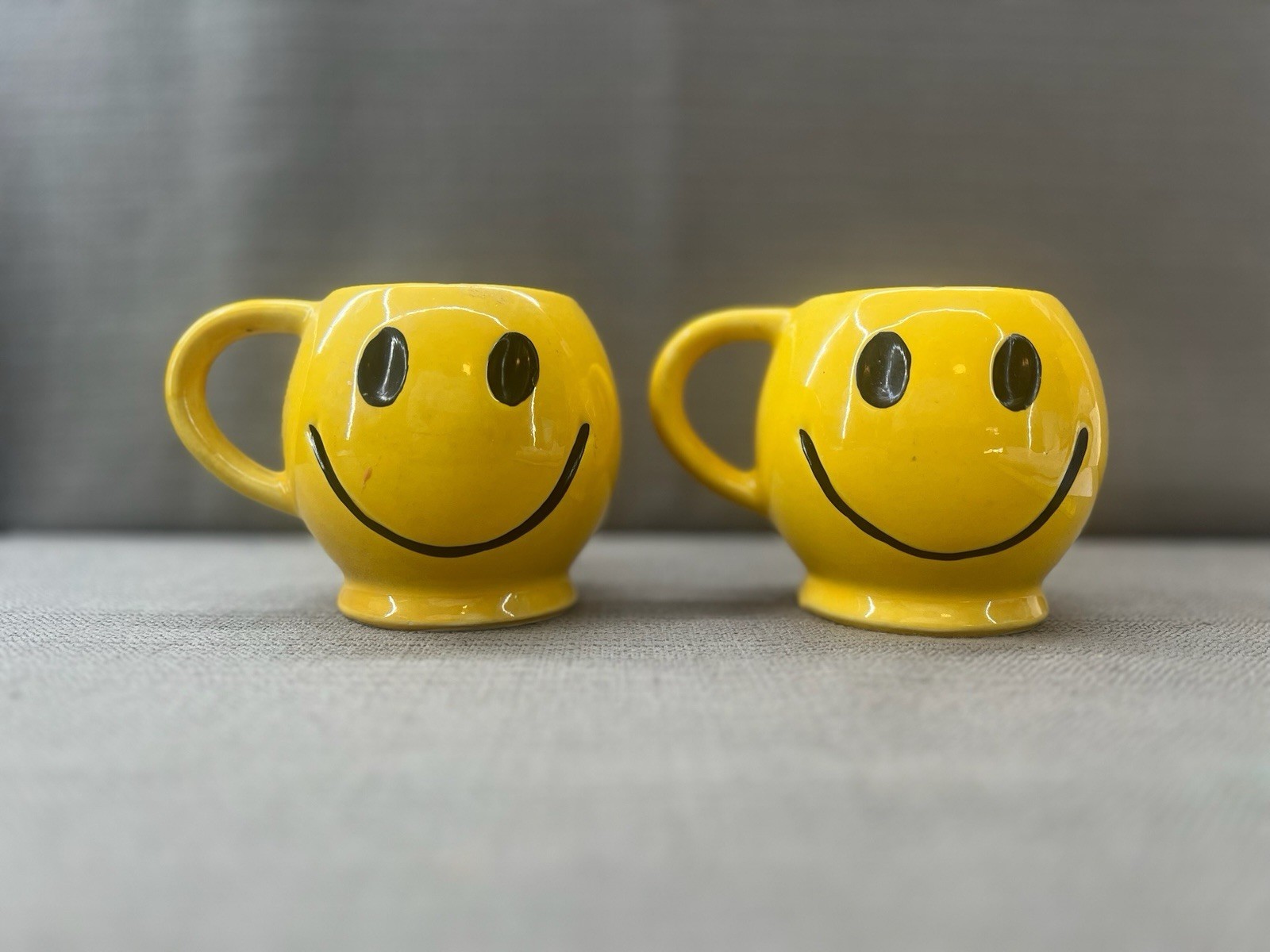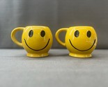 Pair of vintage 1970s McCoy Pottery Smiley Face mugs, featuring the iconic bright yellow glaze and classic black smiley face design. These mugs capture the cheerful, retro spirit of the Happy Face movement that defined 1970s pop culture.