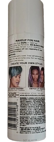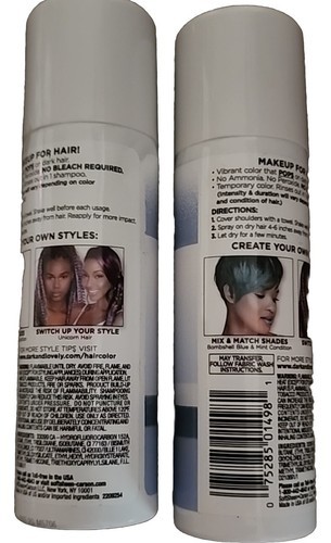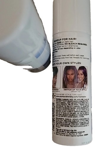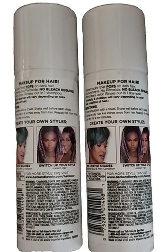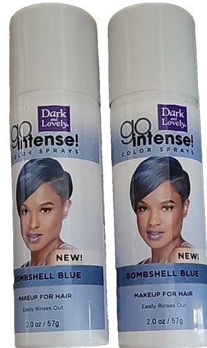 This Sale is for Two (2) Dark and Lovely Brand Hair Makeup Shade is Bombshell Blue Aerosol spray Vibrant color that pops on dark hair No Ammonia No Peroxide No Bleach Temporary hair color ~ washes out in one shampoo Hair makeup is new in original packaging Please view photos for a good description of this item Thank you!