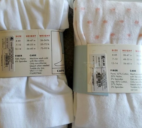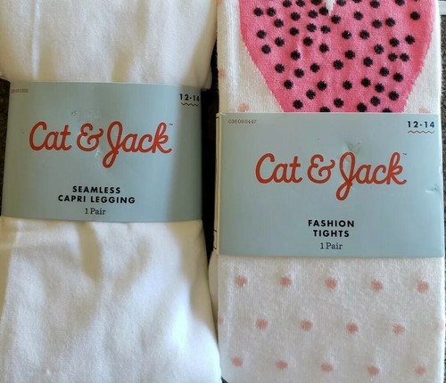 This sale is for Cat Jack Brand Fashion Tights Seamless Capri Leggings You will receive: One (1) Pair of Fashion Tights, Multi Colored with Heart Design Polka Dot One (1) Pair of Seamless Capri Legging - White Size Girl's 12-14 Fits Height 56" - 60" Fits Weight 73 - 95 Pounds Both items are brand new with tags from Target Please see photos for a good description of colors Thank you!