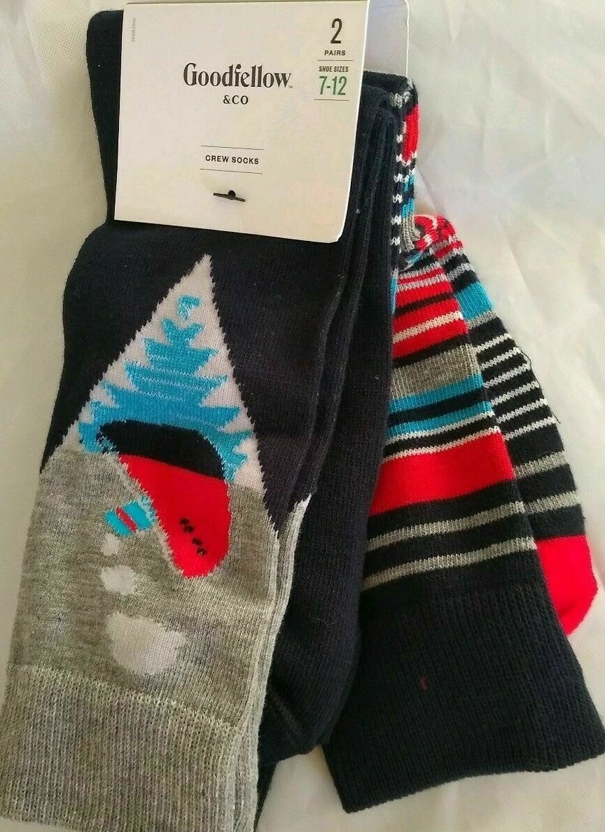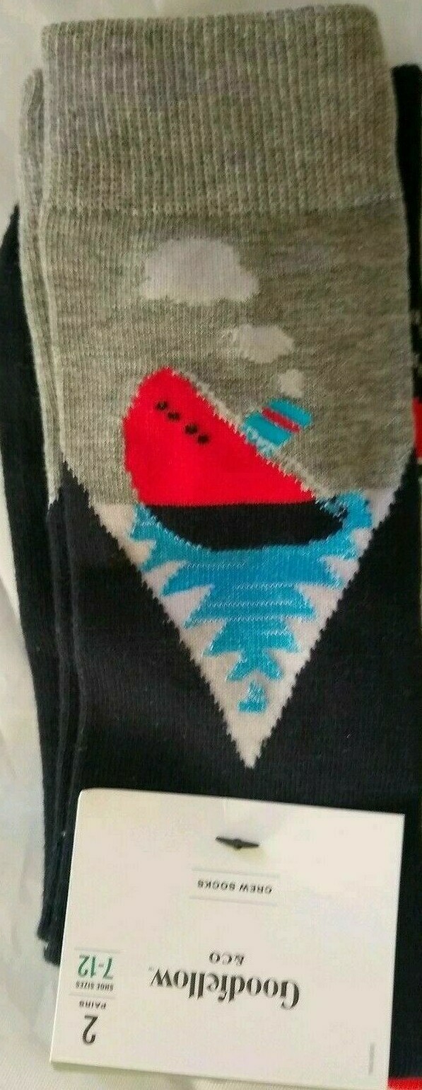 This sale is for Two (2) pair of Goodfellow Co? Men's Novelty Crew Socks Perfect for any occasion You will receive One (1) pair of Red ~ White ~ Blue Gray Striped (1) pair of Red ~ Blue Gray Tug Boat Design Socks Men's Size 7-12 98% Polyester 2% Spandex Machine wash ~ Tumble dry Socks are brand new in original packaging Please view photos for a good description of these socks Thank you!