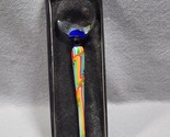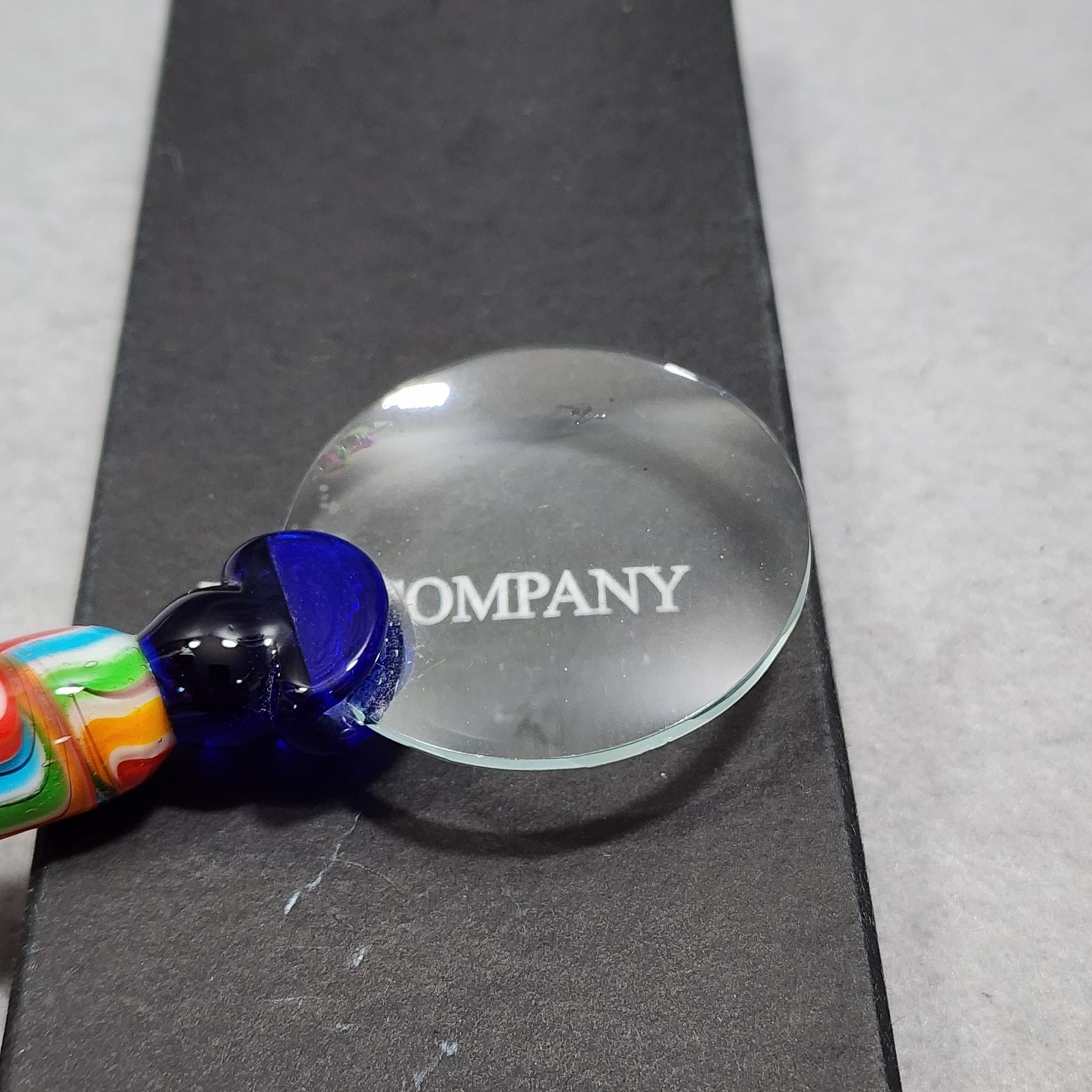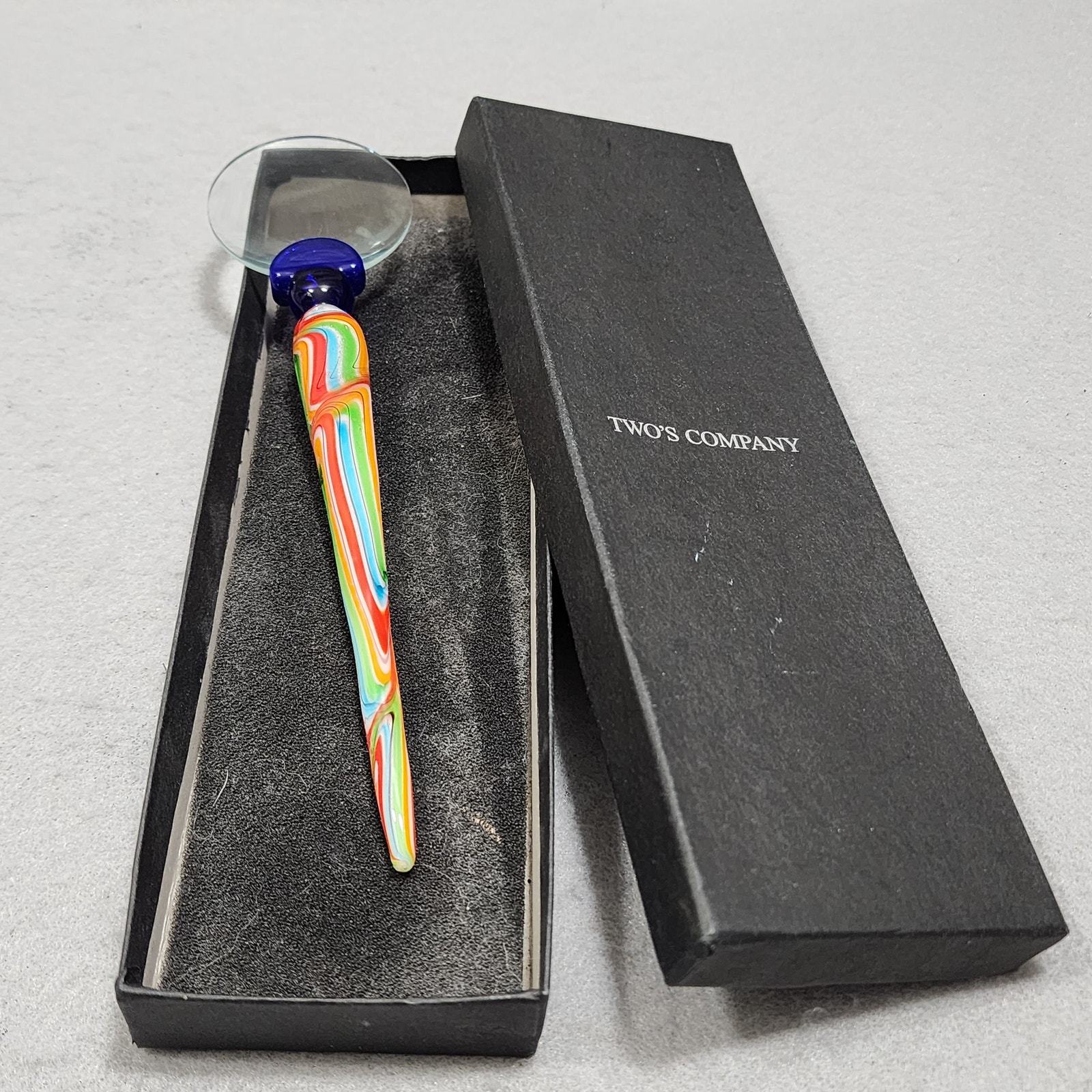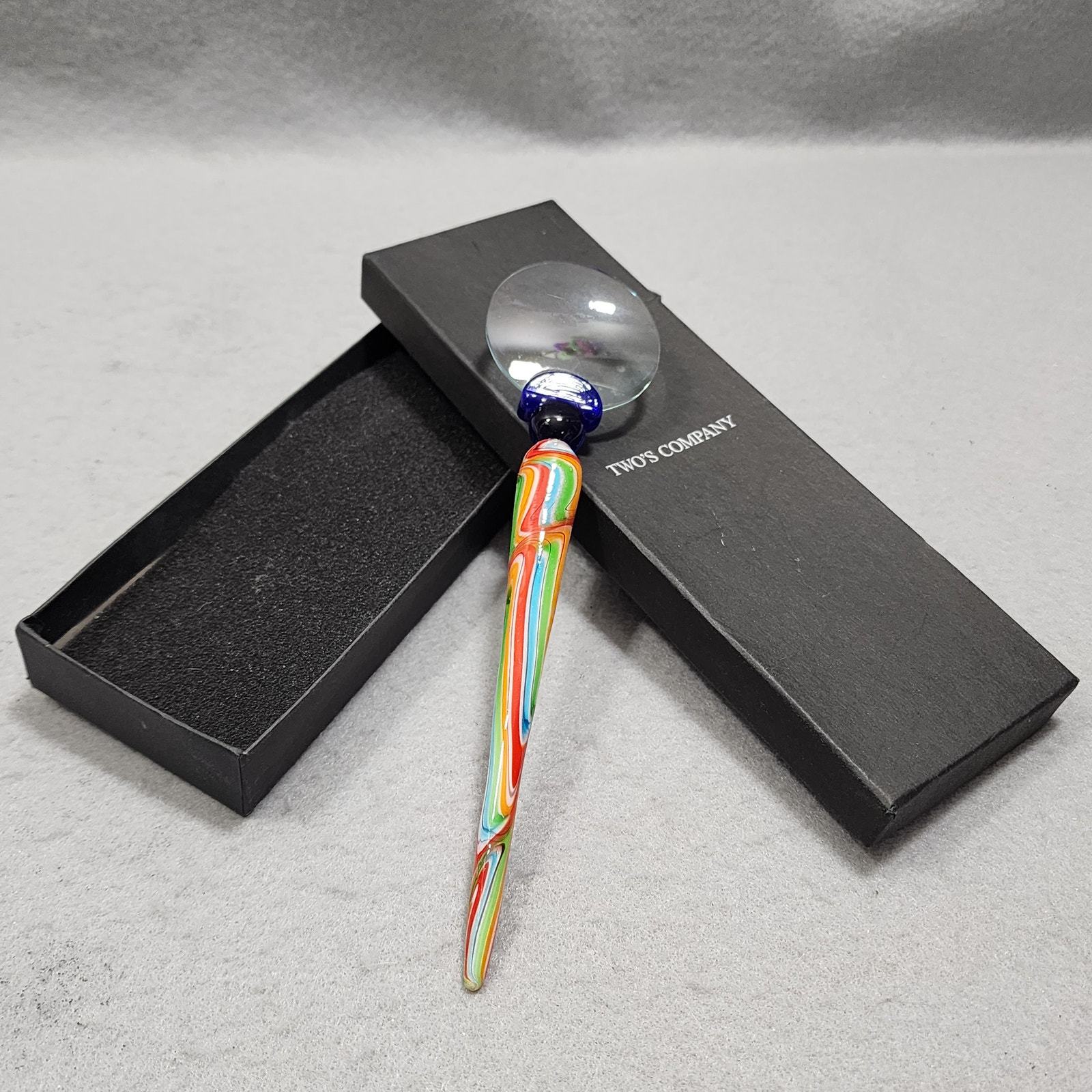 Two's Company Colorful Swirled Art Glass 7.75 Inch Magnifying Glass Loupe Clear glass lens with colorful multicolored swirled handle and small blue sphere connects the handle to the lens. New in gift box. Length 7.75"
