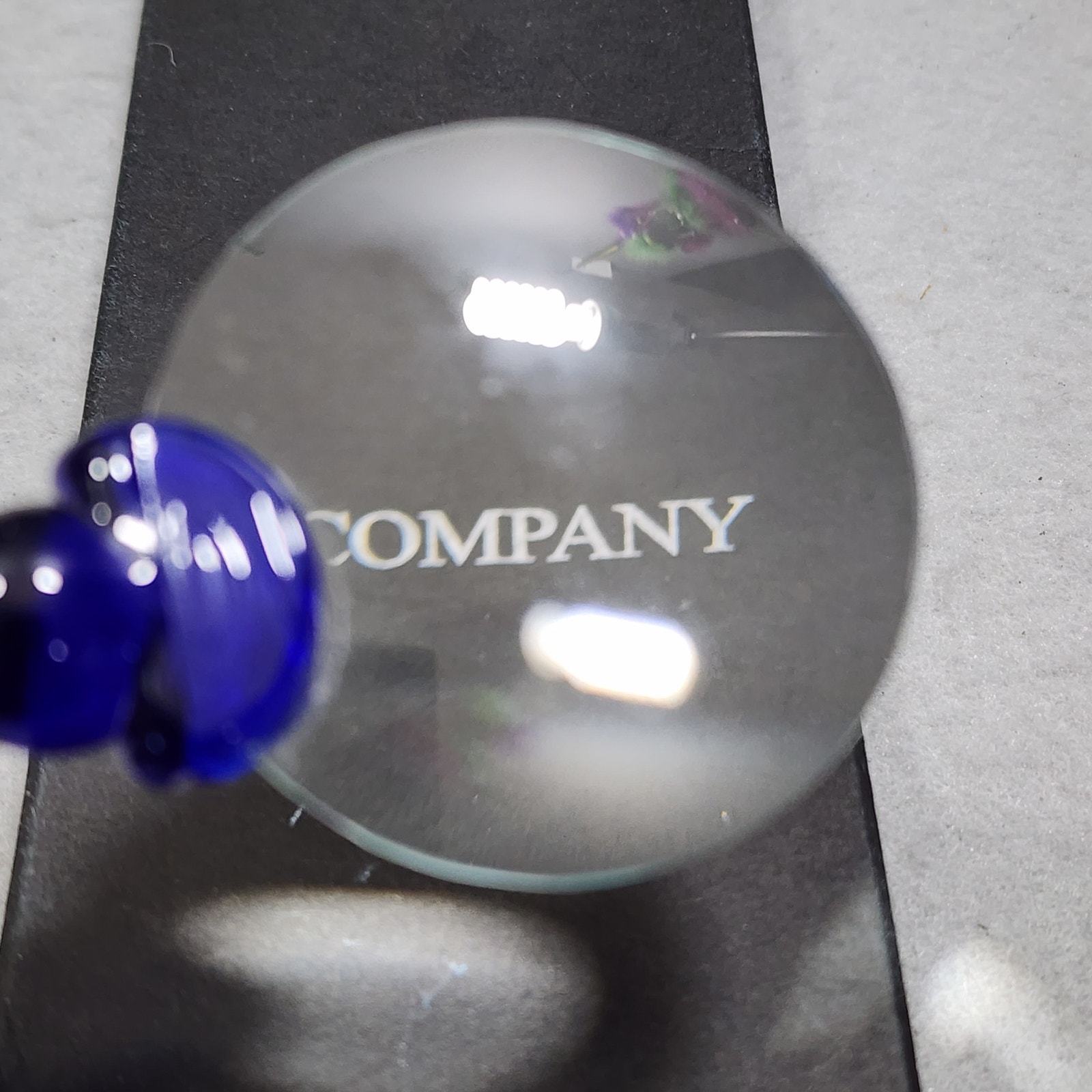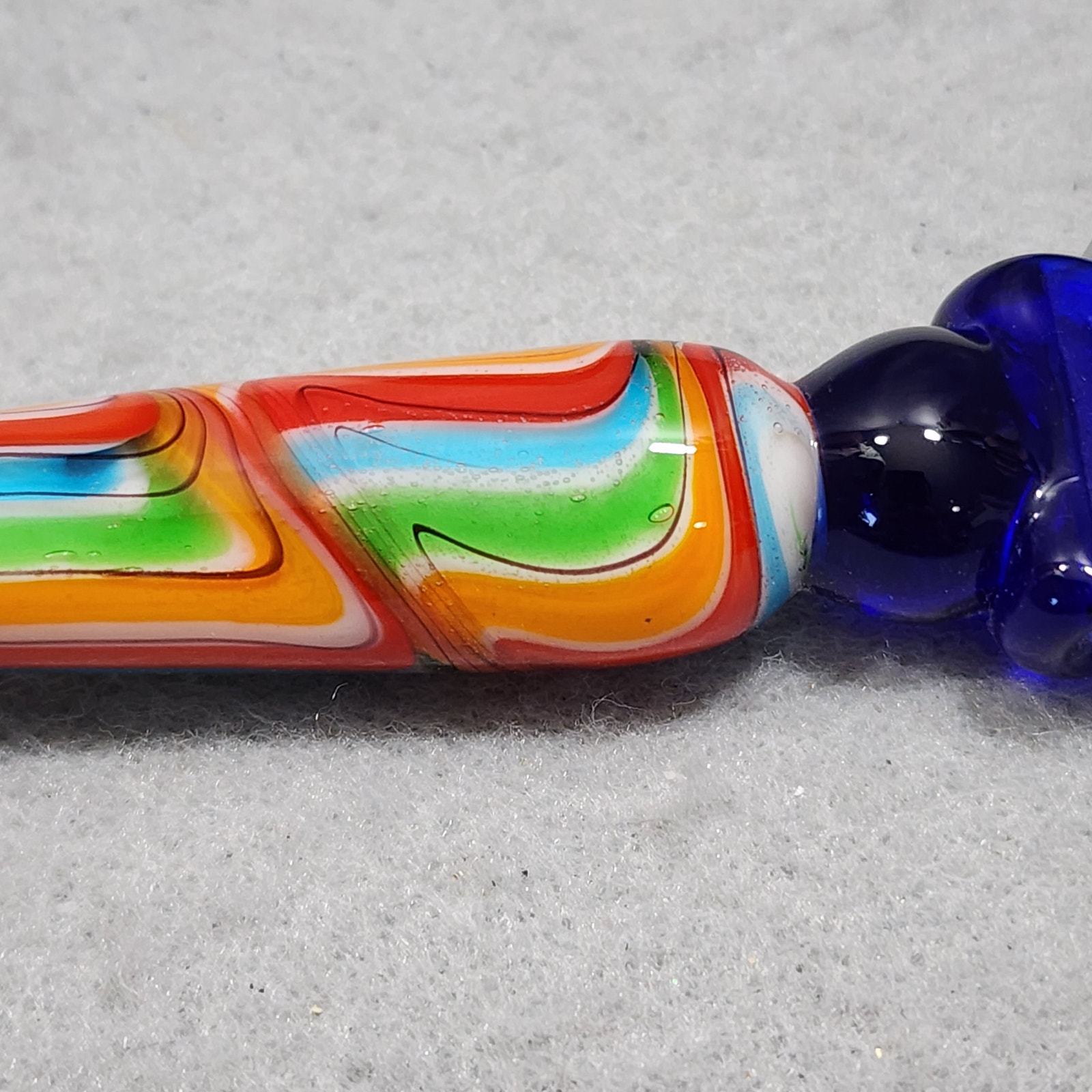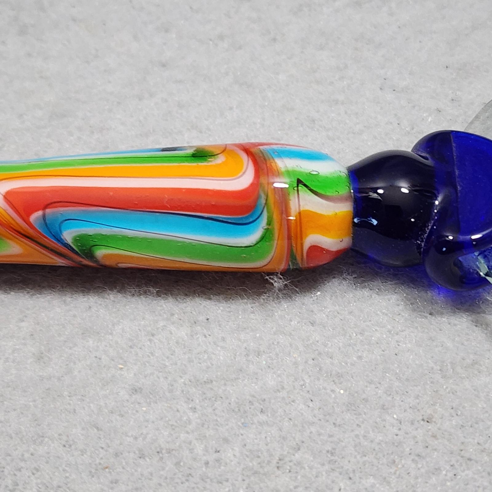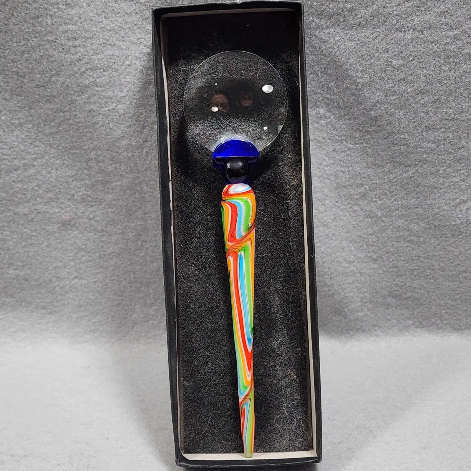 Two's Company Colorful Swirled Art Glass 7.75 Inch Magnifying Glass Loupe Clear glass lens with colorful multicolored swirled handle and small blue sphere connects the handle to the lens. New in gift box. Length 7.75"