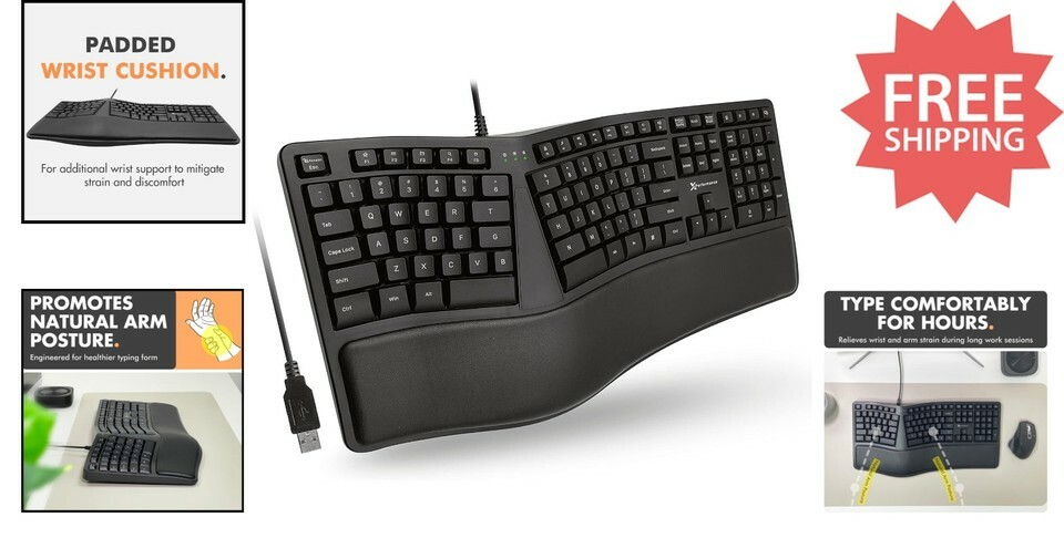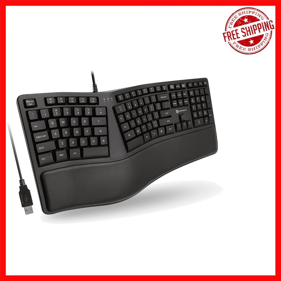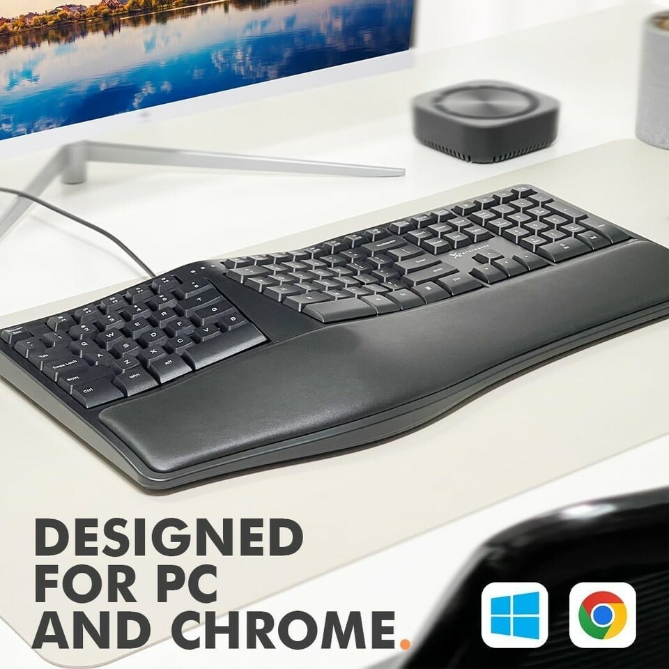 Feel better and work smarter with our ergonomic split keyboard designed to reduce wrist discomfort and enhance productivity. Featuring a cushioned wrist rest, natural wave-shaped split design, and full-sized keys with quick access shortcuts, this wired keyboard ensures comfortable, efficient typing for long hours. Compatible with PC and Chrome devices?simply plug in and start working?no driver installation required. Enjoy reliable support, a 2- , and easy returns with your purchase.