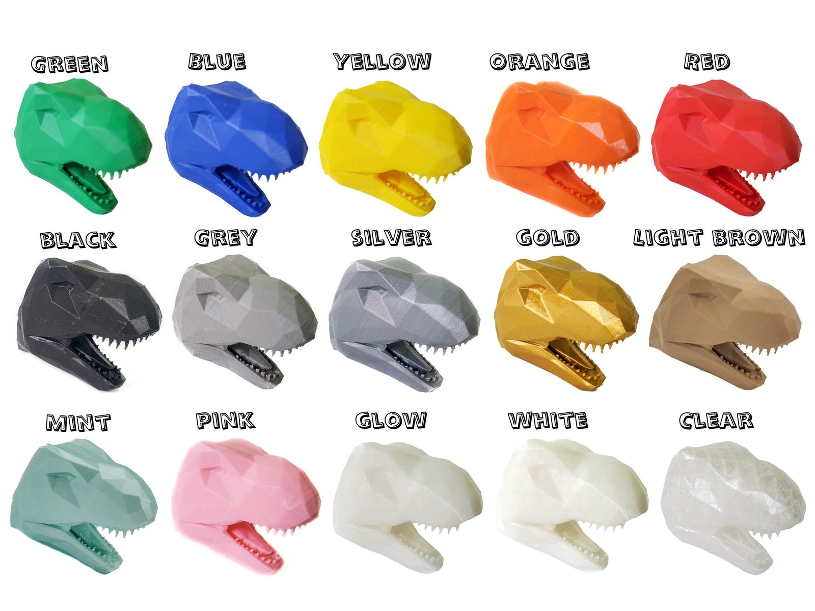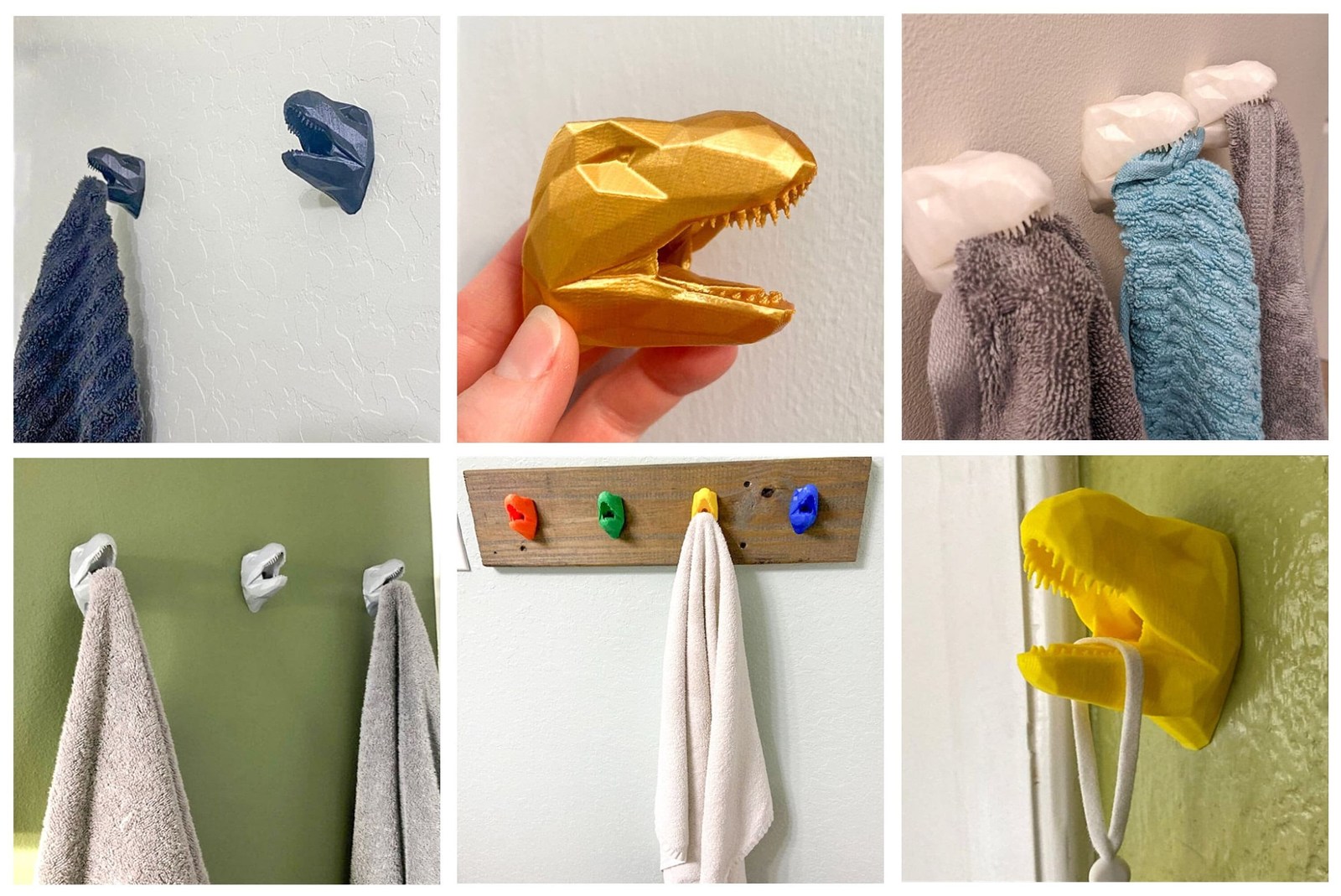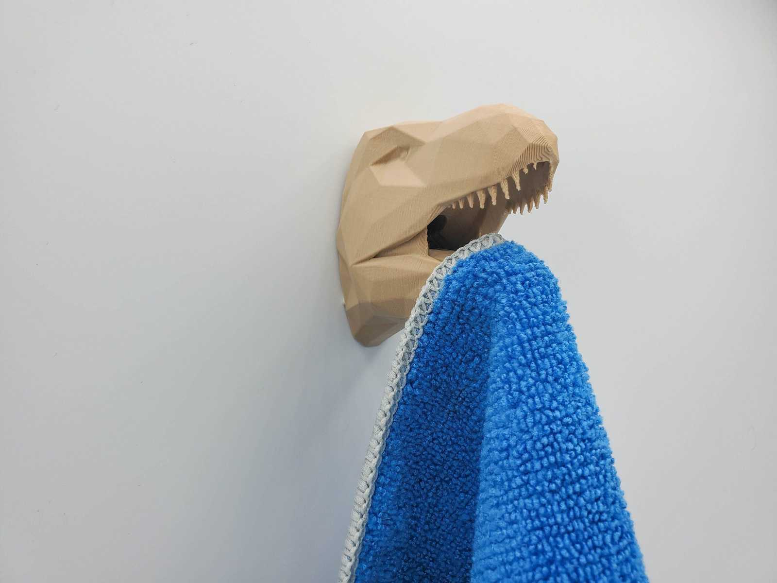 This T-Rex won't bite, but it'll sure hold onto your towels, clothes and purses like a Jurassic champ. This dino-shaped holder keeps your stuff safe while making Jurassic style statements. ? Leave the kids wondering if the rest of the T-rex is inside the wall! These decorative yet useful Tyrannosaurus Rex wall hangers come in all colors. The bottom teeth are just sharp enough to provide the right amount of friction to hold full size bath towels, clothes, headphones, heavy bags, hats, large coats, backpacks, washcloths or whatever without snags. They have a small hole in the throat where they can be screwed into drywall or a stud (not included). You can buy them in white and paint them to look realistic. Designed using the head from this dinosaur model: https://www.thingiverse.com/thing:73484
