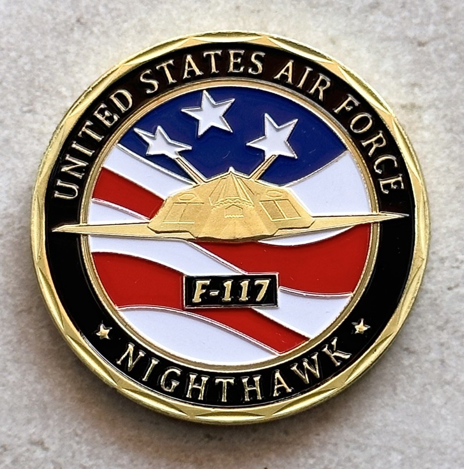 U S AIR FORCE F-117 NIGHTHAWK Challenge Coin. This is a great looking US AIR FORCE F-117 Nighthawk challenge coin. Coin has reeded edges and is about 1 9/16" in diameter. All details are raised lettering and gold plated. Coin is contained in an acrylic air tight holder. The Lockheed F-117 Nighthawk is a single-seat, twin-engine stealth attack aircraft that was developed by Lockheed's secretive Skunk Works division and operated by the United States Air Force (USAF). The F-117 was based on the Have Blue technology demonstrator, and was the first operational aircraft to be designed around stealth technology. The maiden flight of the Nighthawk happened in 1981 and the aircraft achieved initial operating capability status in 1983. The Nighthawk was shrouded in secrecy until it was revealed in 1988. The F-117 was widely publicized for its role in the Gulf War of 1991. Although it was commonly referred to as the "Stealth Fighter", it was a strictly ground-attack aircraft. F-117s took part in the conflict in Yugoslavia where one was shot down by a surface-to-air missile by a (SAM) on 27 March 1999, the only Nighthawk to be lost in combat. The Air Force retired the F-117 on 22 April 2008, primarily due to the fielding of the F-22 Raptor. Sixty-four F-117s were built, 59 of which were production versions with the other five being demonstrators/prototypes.