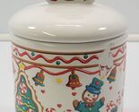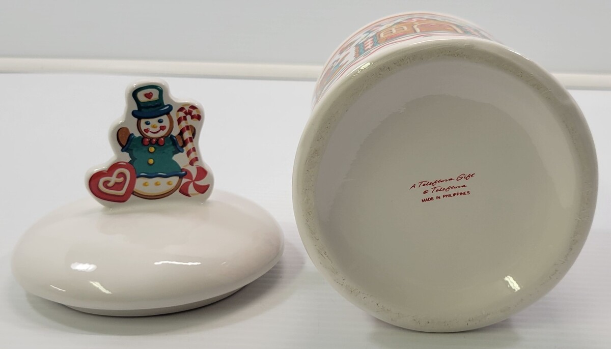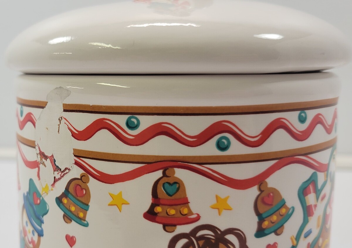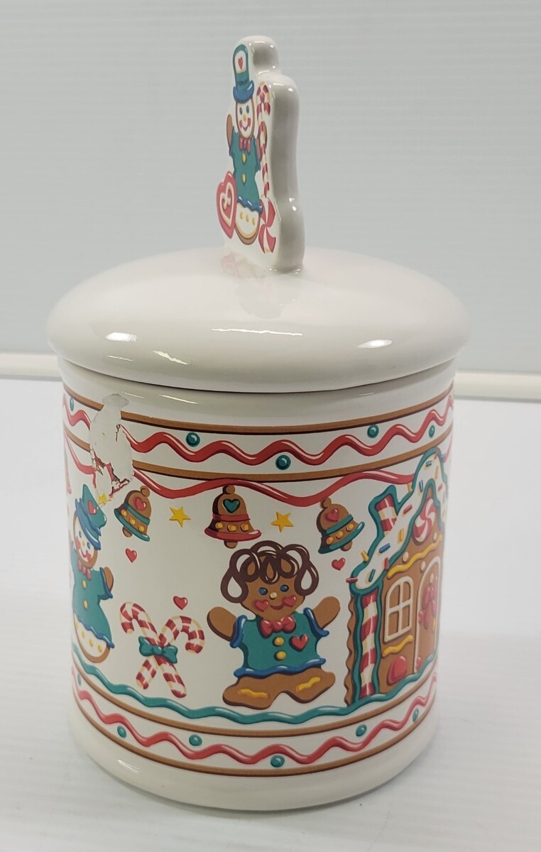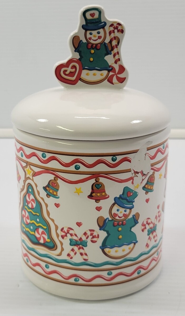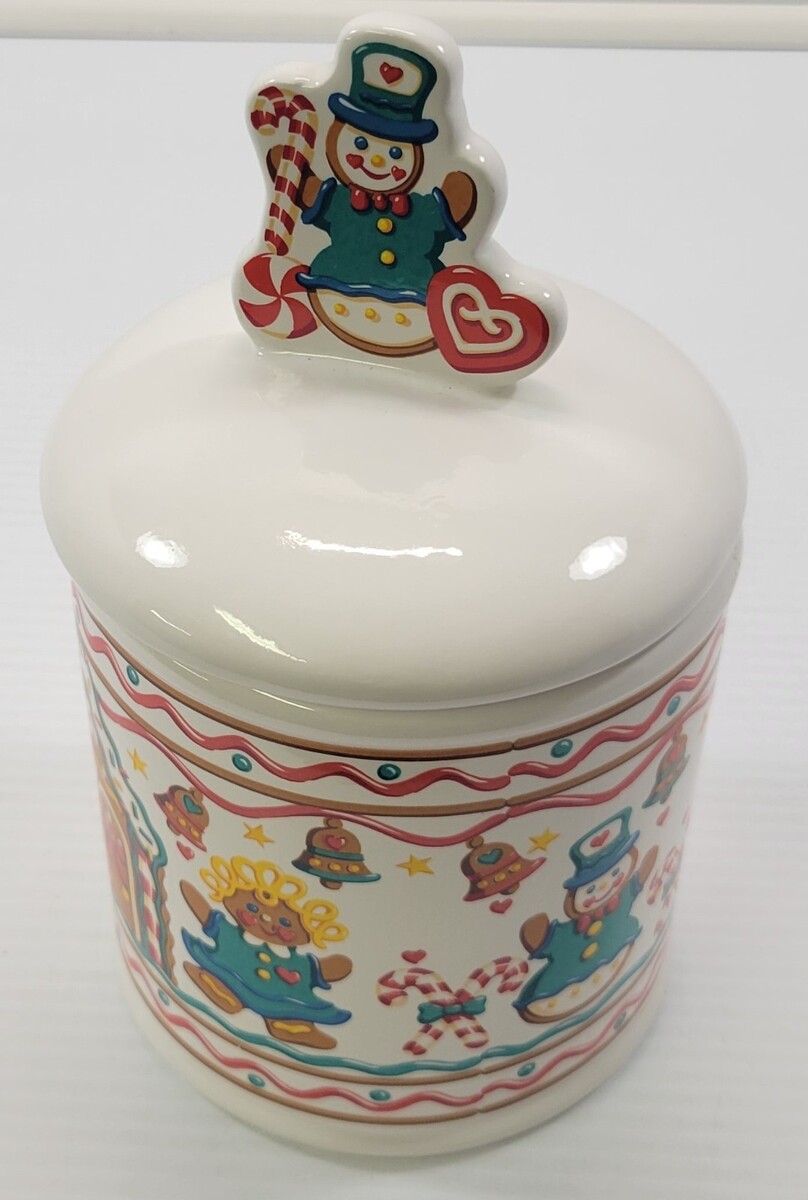Vintage Teleflora Gift Ceramic Christmas Canister Gingerbread Cookie Jar Jar measures about 9" in total height to tip of lid knob Jar measures about 5" high without lid Jar has an approximate 5" diameter Cookie jar has a slight surface scrape to the graphic finish but is not chipped or cracked. The imperfection blends in a bit with the graphics and visible when examined closely. Other than that, jar is in good vintage, used condition with seasonal use and storage.