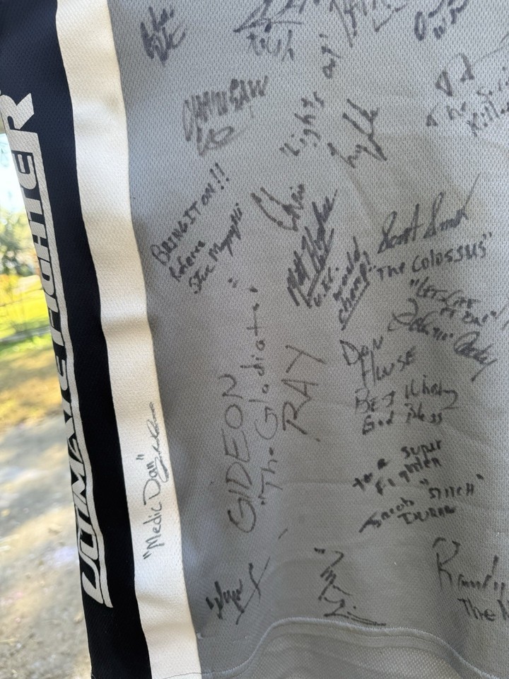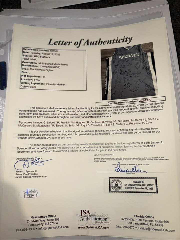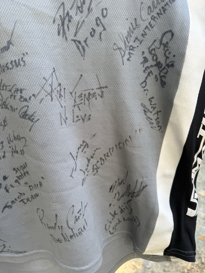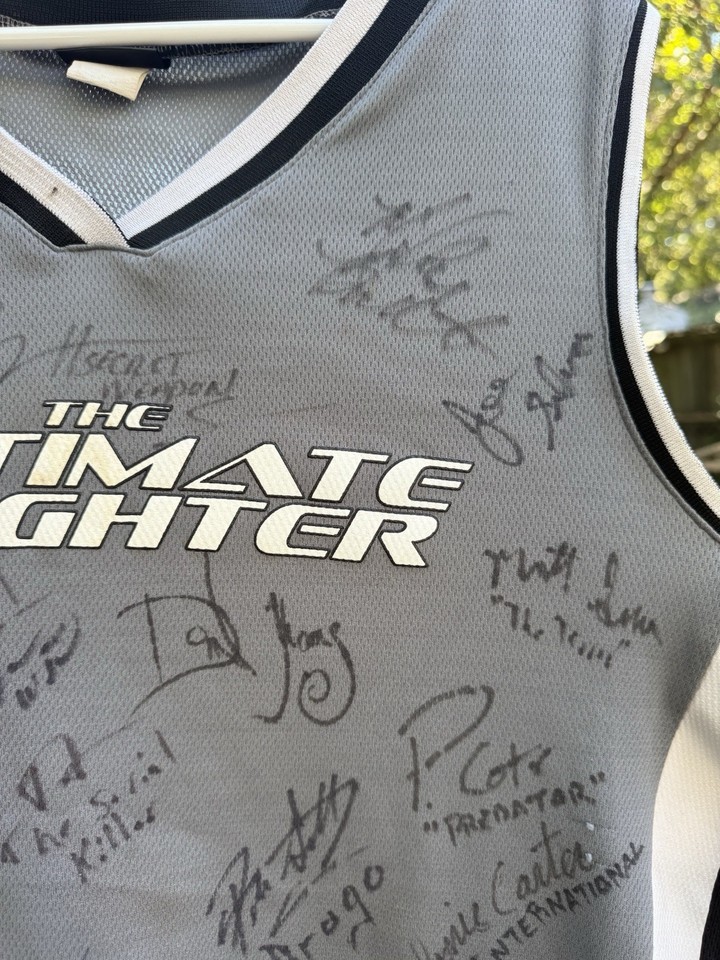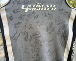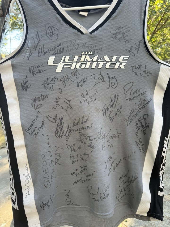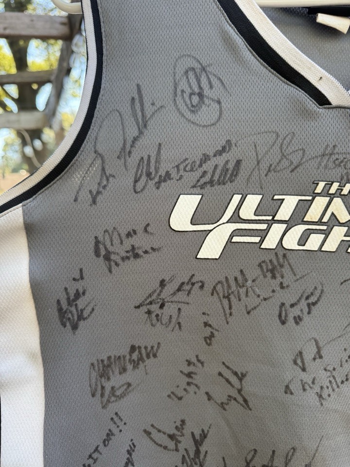 This is a very rare item and you may never have a chance to own a piece this special again. Its is an Ultimate Fighter Season 4 The Comebacks season used jersey. This has several amazing things going for it. It is screen worn during the show by a fighter. It has been signed by the boss himself Dana White. It has super rare signature of matchmaker Joe Silva. It has been signed by multiple hall of famers. It has GSP and he inscribed his nickname Rush which he rarely ever did. Signed by multiple former champions and some of the biggest names in UFC history. This is a special piece.