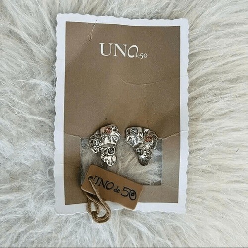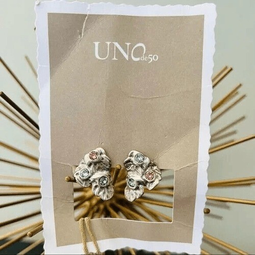 UNO de 50 Wild Bush Bezel Set Crystal Leaf Stud Earrings Color: Silver/Pink/Multi New with tags attached in original packaging Silver bezel set crystal leaf stud earrings - Post back - Approx. 1 length - Made in Spain 15 microns silver, crystal