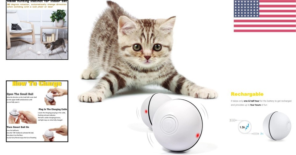 Features: USB Rechargeable,360 Degree Self Rotation,Automatic Direction Change,Automatic Shut Off,Built-in Spinning LED Light,Stimulates Hunting Instinct,No need to replace batteries,1.5 hours charging time,4 hours of playtime,Attracts pet's attention,Red light effect,Self balancing system,Suitable for flat hard surfaces,Rolls best on hard floors,Caution for thick carpets,Easy to use,Turn on/off functionality
