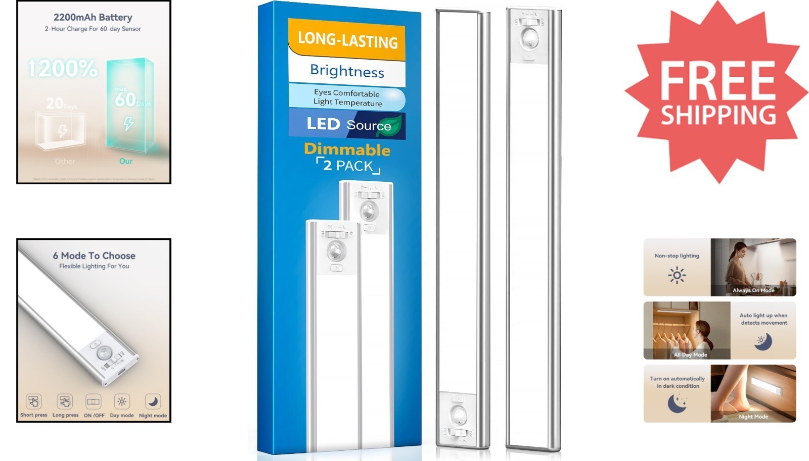 Long-Lasting Battery USB Charging: High-capacity 2200mAh rechargeable battery provides up to 10 hours of brightness in "always on" mode. Switch to automatic sensor mode for 40-60 days of hands-free operation with fast USB-C charging in just 2 hours (includes 2 USB-C cables).