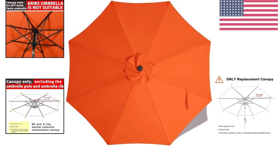 Perfectly fits 9ft umbrella frames with 8 ribs measuring 52" to 54".