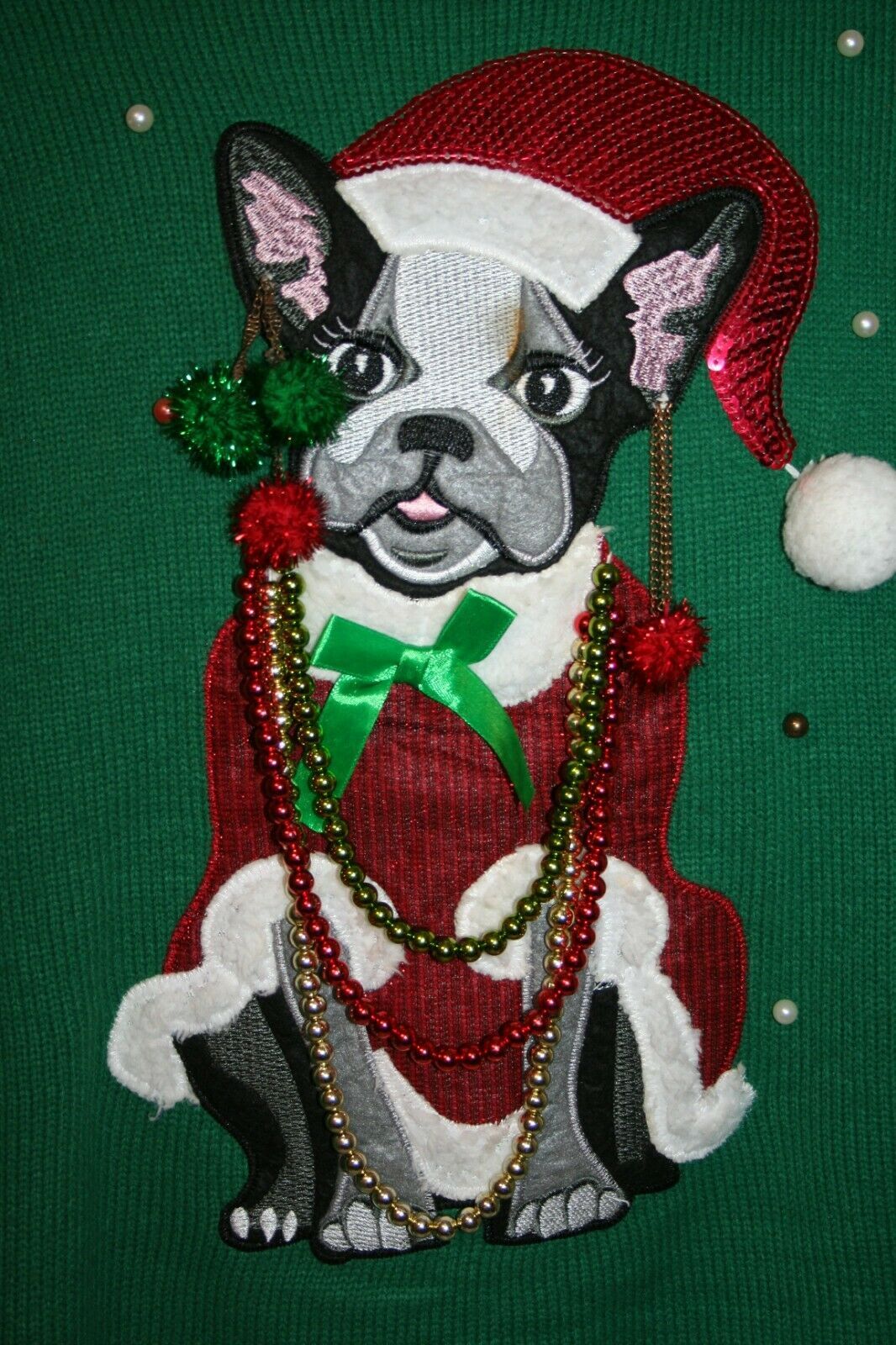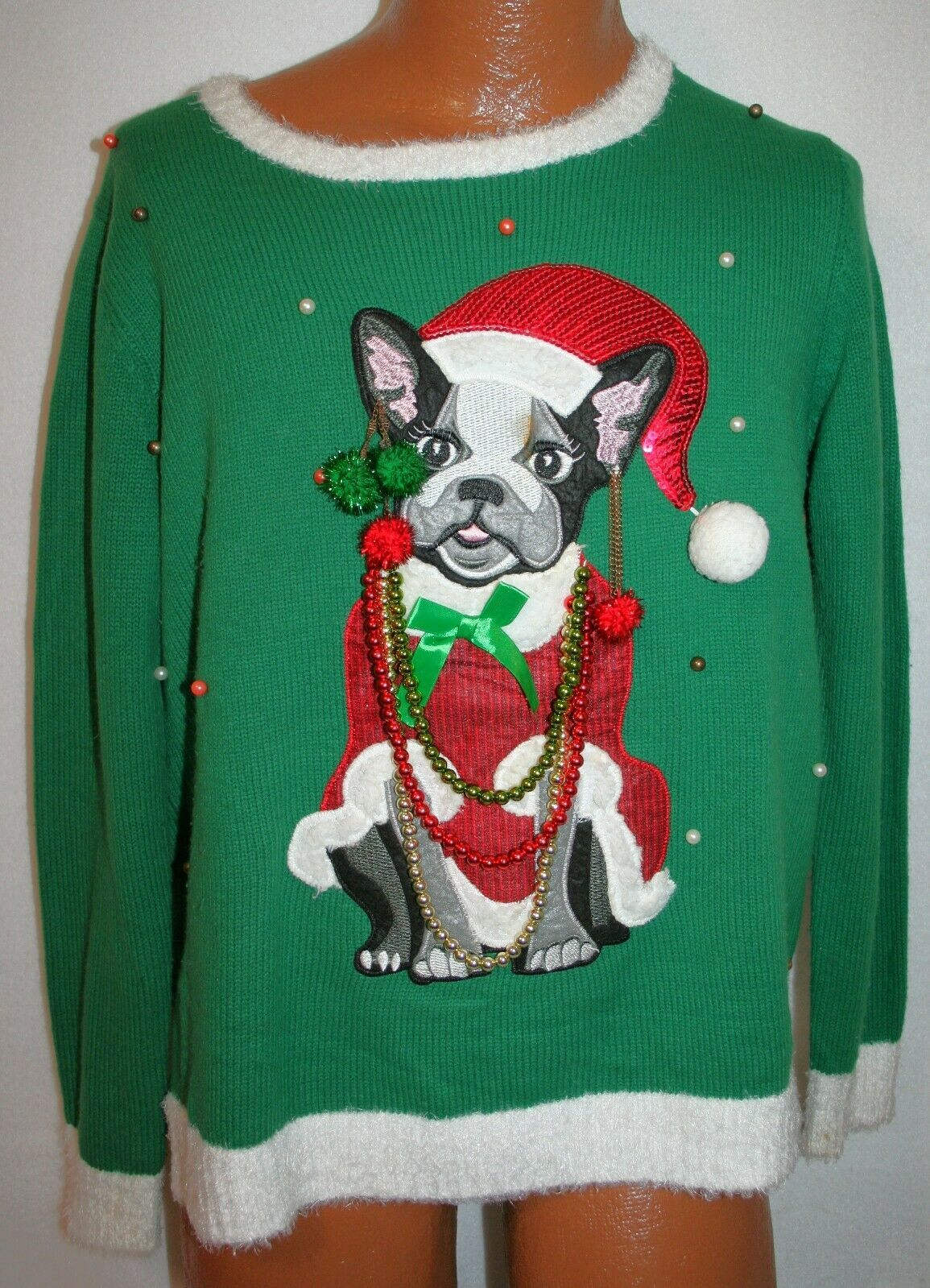 Ugly Christmas Sweater Pug Dog With Beads Sequins & Balls Women's Large Holiday
