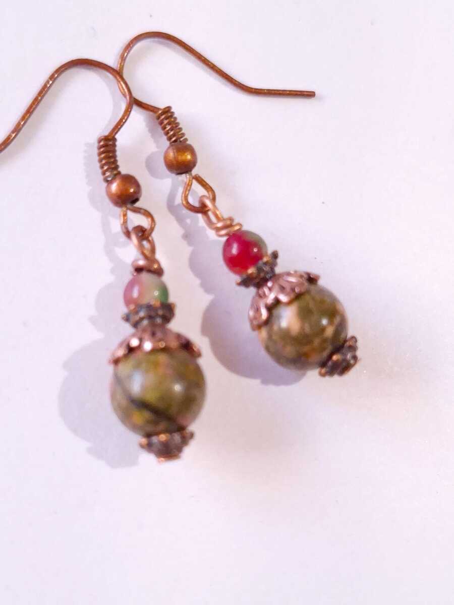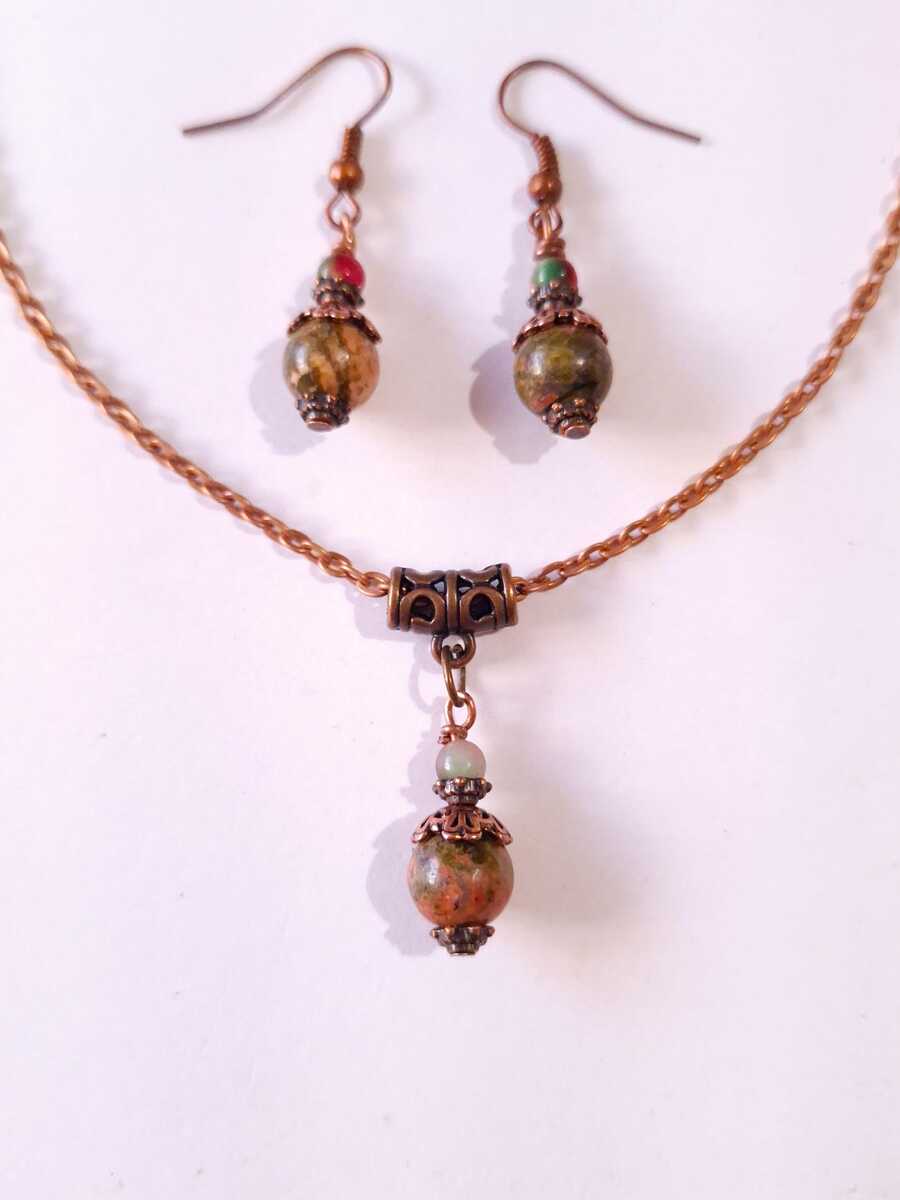 - Unakite Agate Copper Earrings Necklace Set: Boho Jewelry