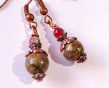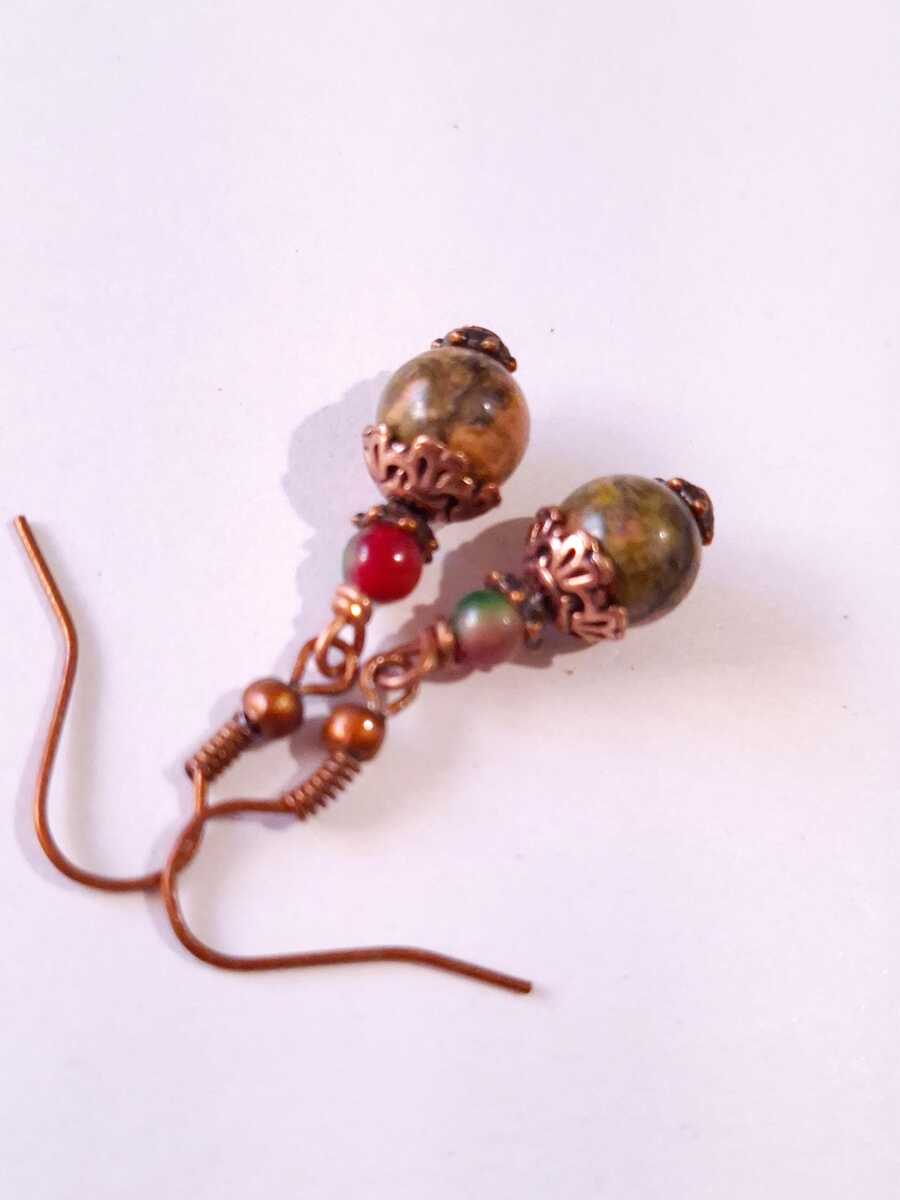Beautiful Set of copper-tone Antique style ornamented beads and caps and Unakite gemstones and little green-red-white Agate necklace and earrings . Copper Victorian style necklace and earrings . Boho necklace . Boho earrings. Bohemian necklace and earrings . Romantic necklace and earrings .