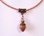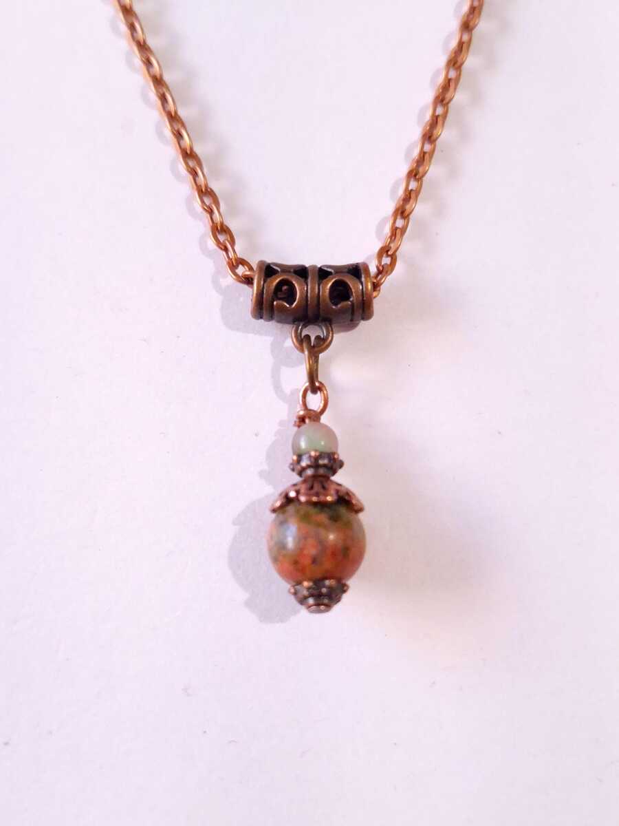 Material: Unakite, Agate, copper, copper toned metal ornament beads , copper pleated chain .