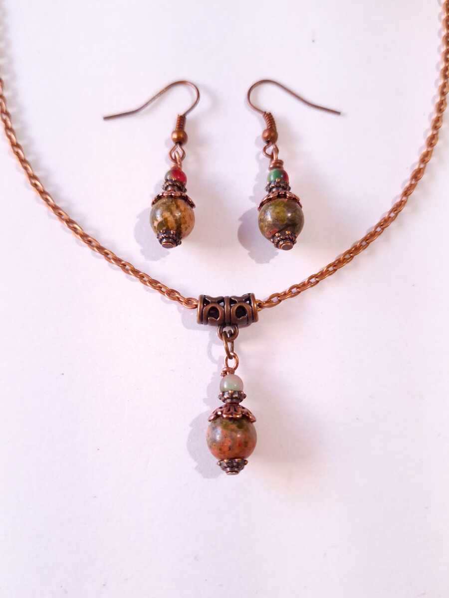- Unakite Agate Copper Necklace Earrings Set: Boho Filigree Jewelry