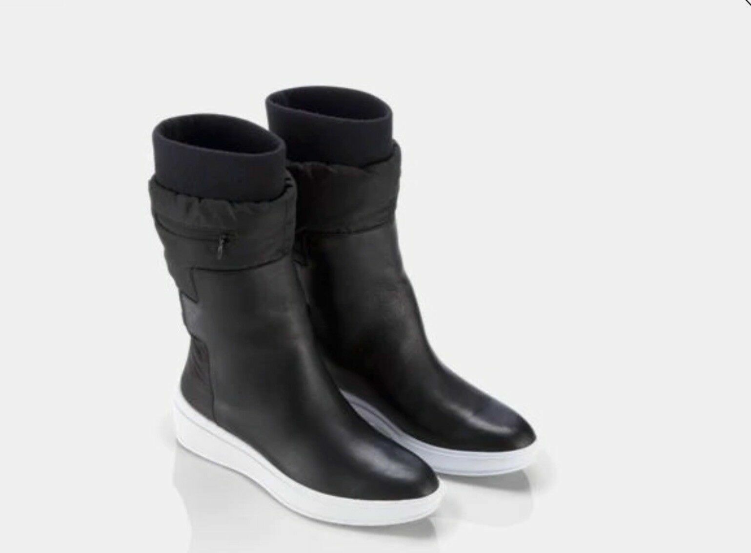 Under Armour 1297600 001 UAS Women's Elevated Black Leather Winter Boot Woven upper with aniline leather overlays Fleece-lined for warmth comfort Ribbed top cuff Hidden zip card pocket Back elastic heel EVA foam midsole Rubber outsole