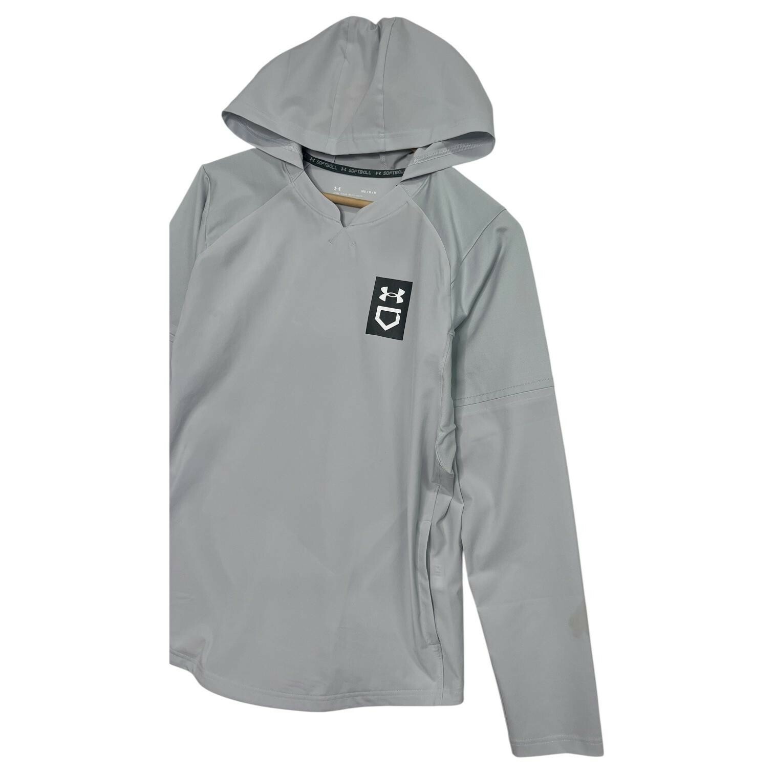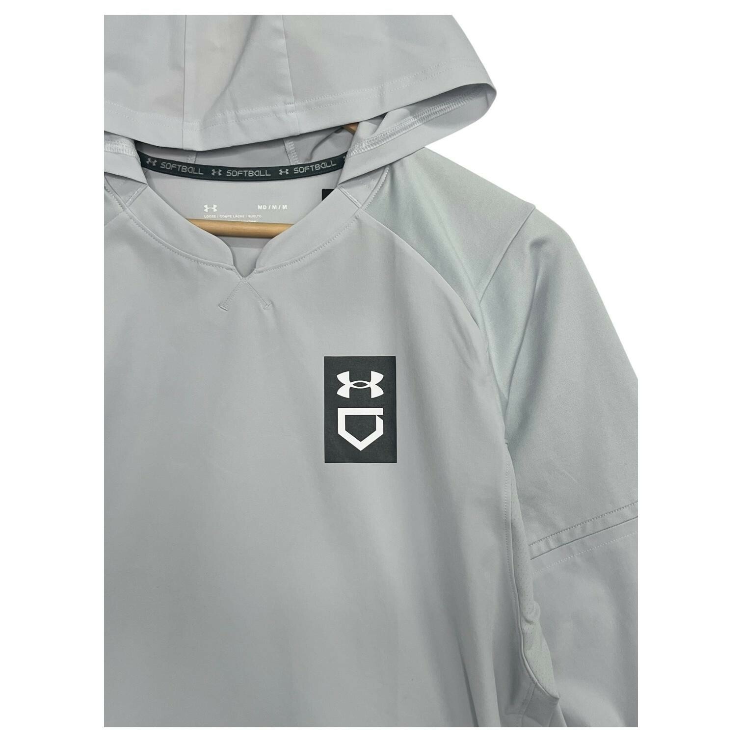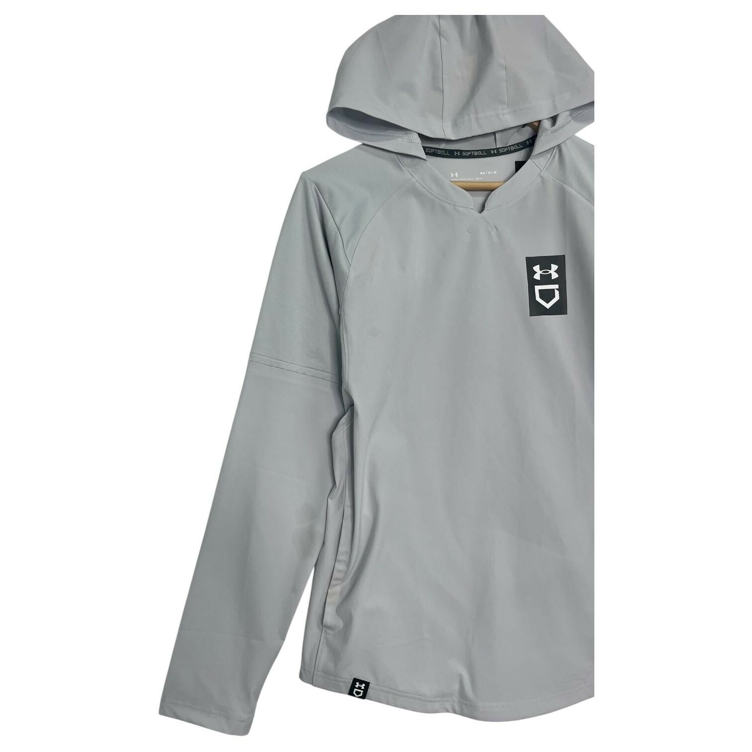 Under Armour Softball Hoodie Womens Medium Gray Lightweight Pullover V Neck Sporty, Athletic, Lightweight Brand: Under Armour (UA) Softball line Item: Lightweight hooded pullover (non-zip) with V-neck notch Gender/Size: Womens Medium (MD/M/M) | UA fit: Loose Color: Light Gray Logos/Markings: Under Armour chest shield/UA logo; interior neck tape reads "SOFTBALL" Material: 84% Polyester, 16% Elasterell-P (stretch polyester blend) Features: Hood, raglan sleeves for mobility, side-seam hand pockets, lightweight performance fabric, pullover design, curved hem Measurements: Bust 21 inches; Length 26 inches Country of origin: Made in Vietnam Notes: Great for training, coaching, and casual wear; please compare measurements to a similar item for best fit. New with tags imperfections - faint mark on sleeve near the wrist and a light spot near the side seam - see pics and ask questions for more details.