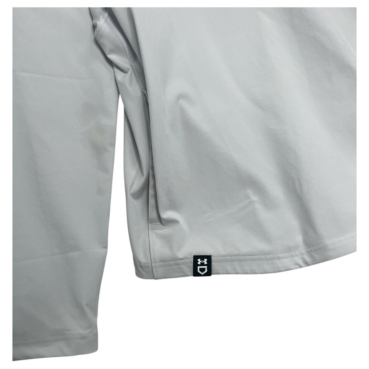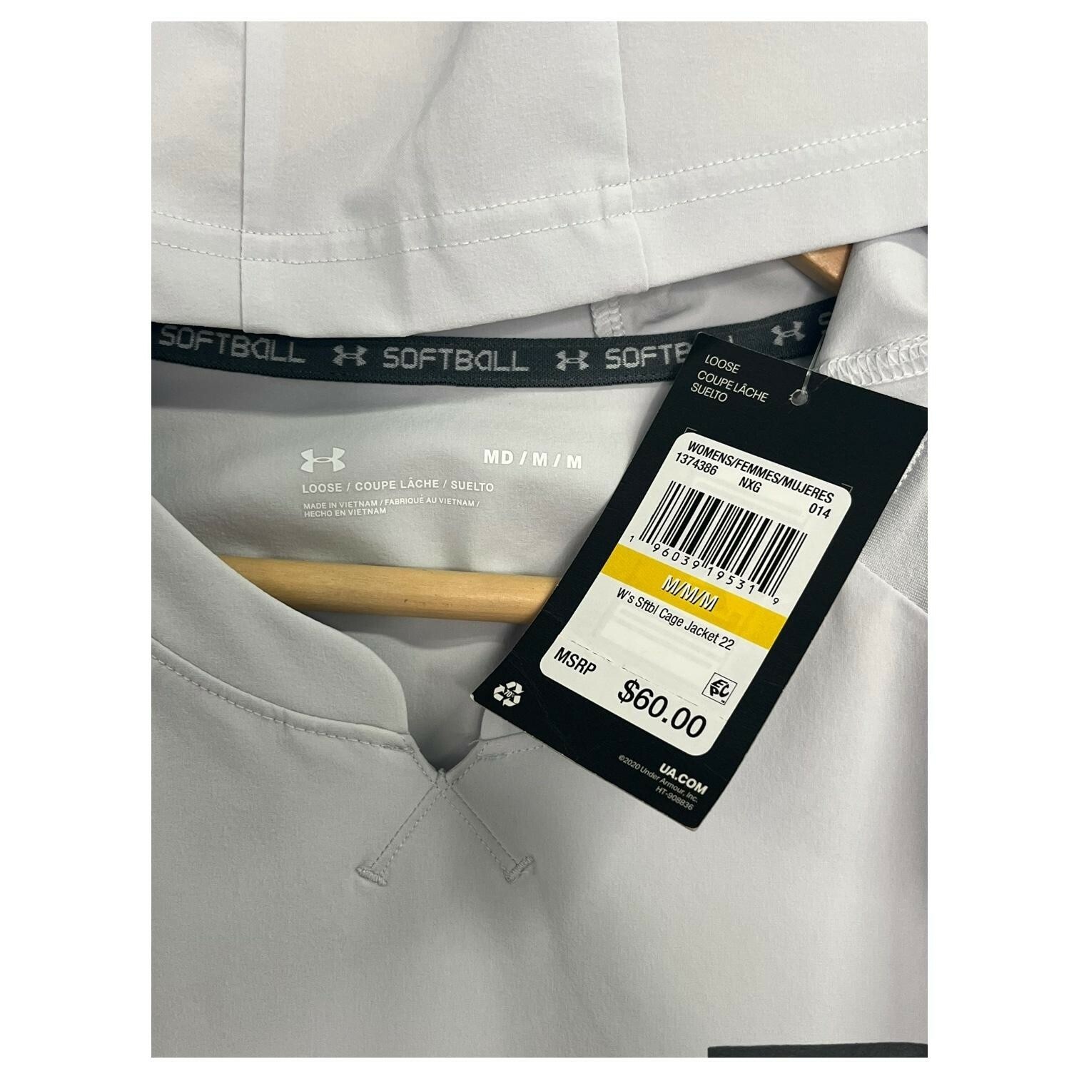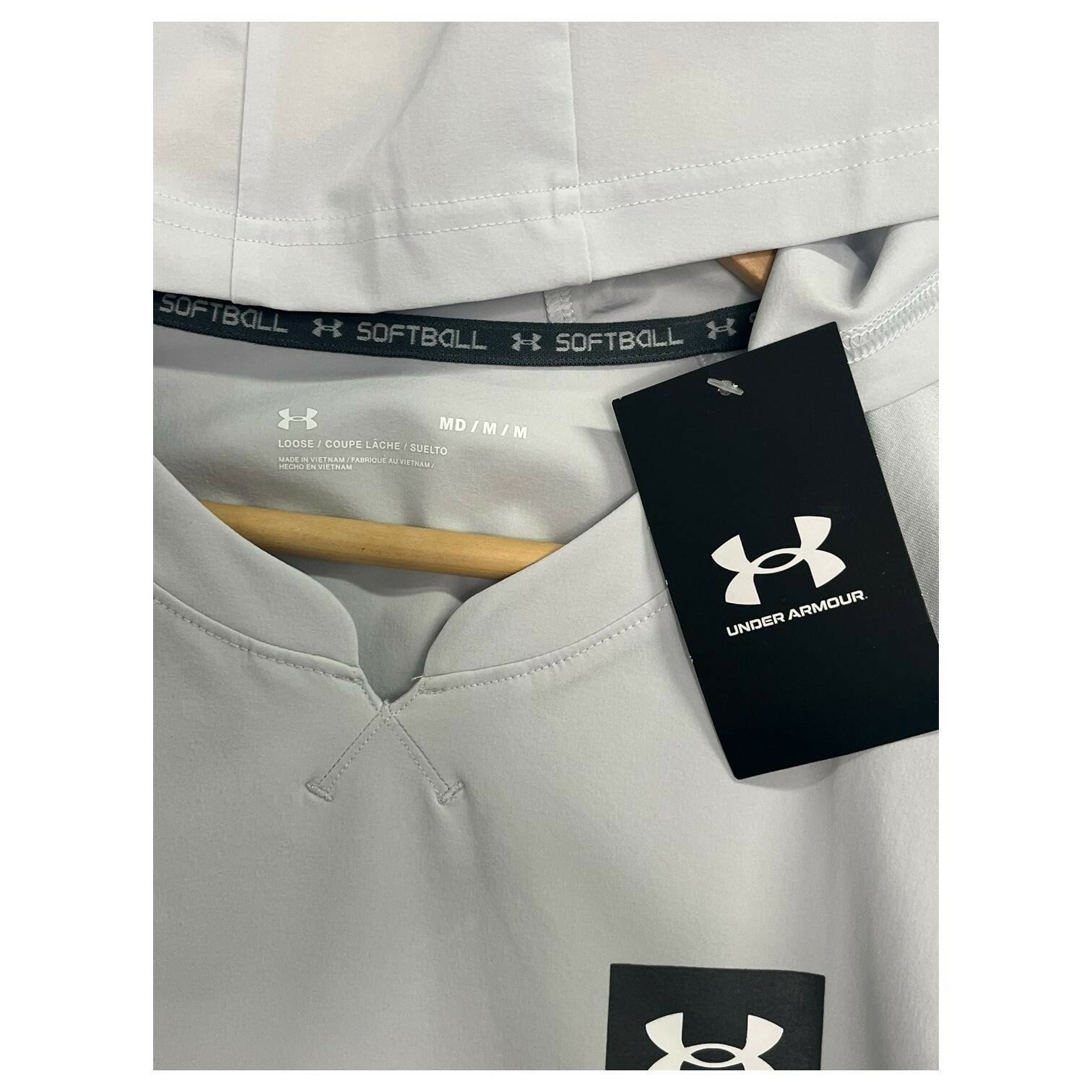 Under Armour Softball Hoodie Womens Medium Gray Lightweight Pullover V Neck Sporty, Athletic, Lightweight Brand: Under Armour (UA) Softball line Item: Lightweight hooded pullover (non-zip) with V-neck notch Gender/Size: Womens Medium (MD/M/M) | UA fit: Loose Color: Light Gray Logos/Markings: Under Armour chest shield/UA logo; interior neck tape reads "SOFTBALL" Material: 84% Polyester, 16% Elasterell-P (stretch polyester blend) Features: Hood, raglan sleeves for mobility, side-seam hand pockets, lightweight performance fabric, pullover design, curved hem Measurements: Bust 21 inches; Length 26 inches Country of origin: Made in Vietnam Notes: Great for training, coaching, and casual wear; please compare measurements to a similar item for best fit. New with tags imperfections - faint mark on sleeve near the wrist and a light spot near the side seam - see pics and ask questions for more details.