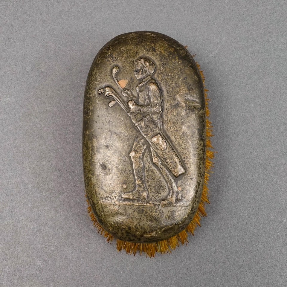 Unger Brothers Sterling Silver Repousse Walking Golf Club Caddy Brush. Measures approximately 4 3/4" long, 2 3/4" wide, 1 5/8" high. Pre-owned condition. Item is being sold as found. No chips, cracks or repairs.