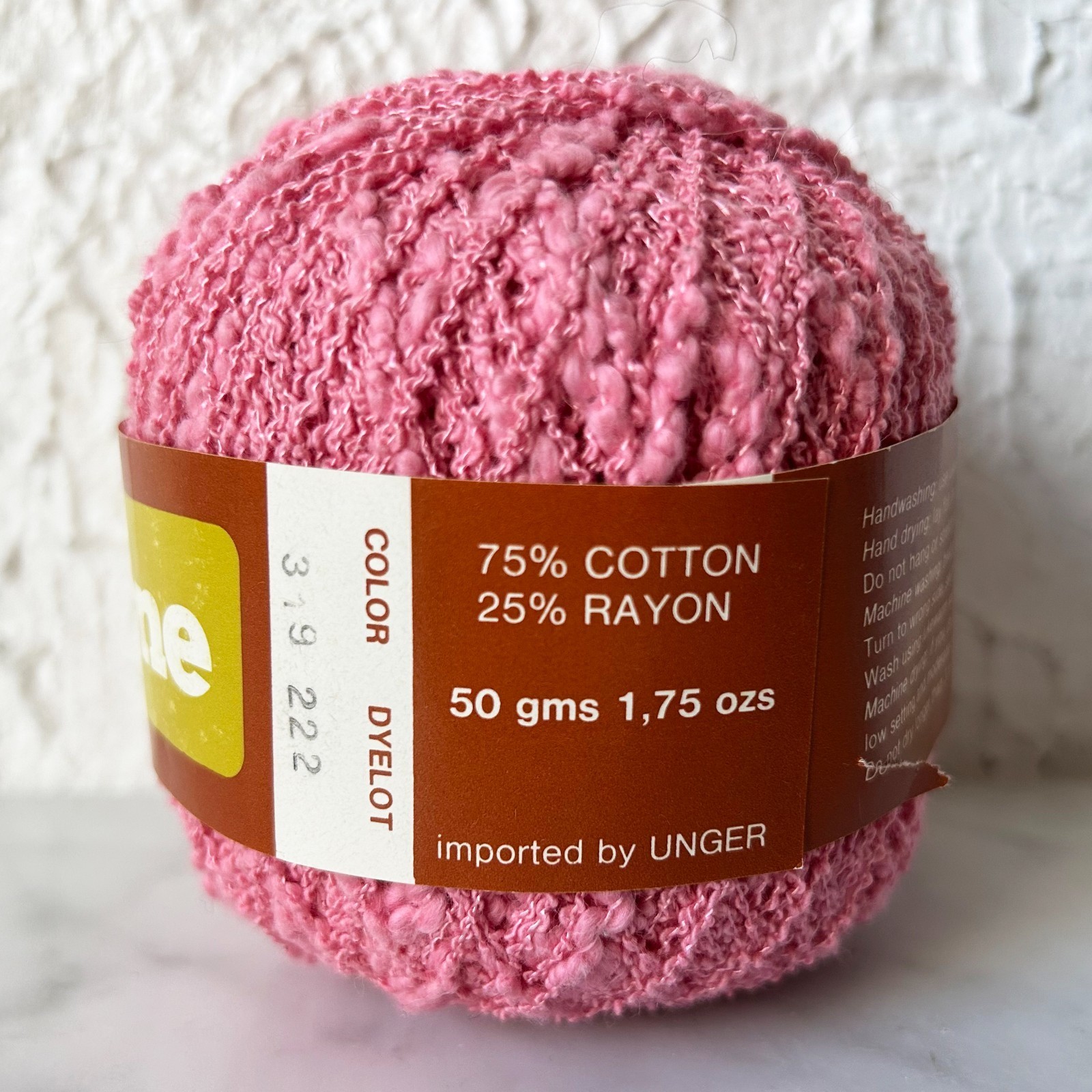 One skein of Unger Riccione yarn. Color Pink #319. 75% Cotton, 25% Rayon. Machine wash and dry. Made in Italy. 1.75 oz/50 grams 130 yards/119 meters