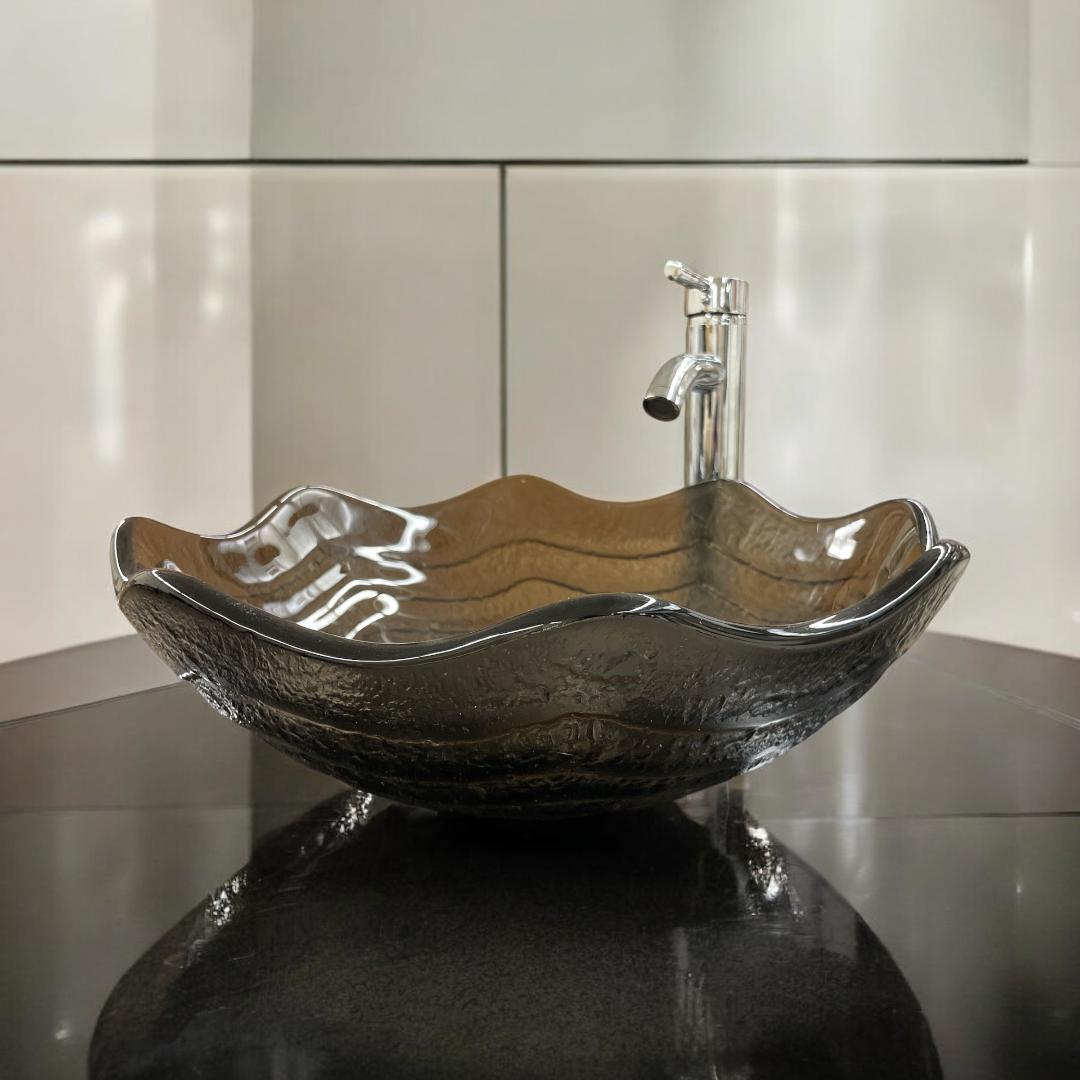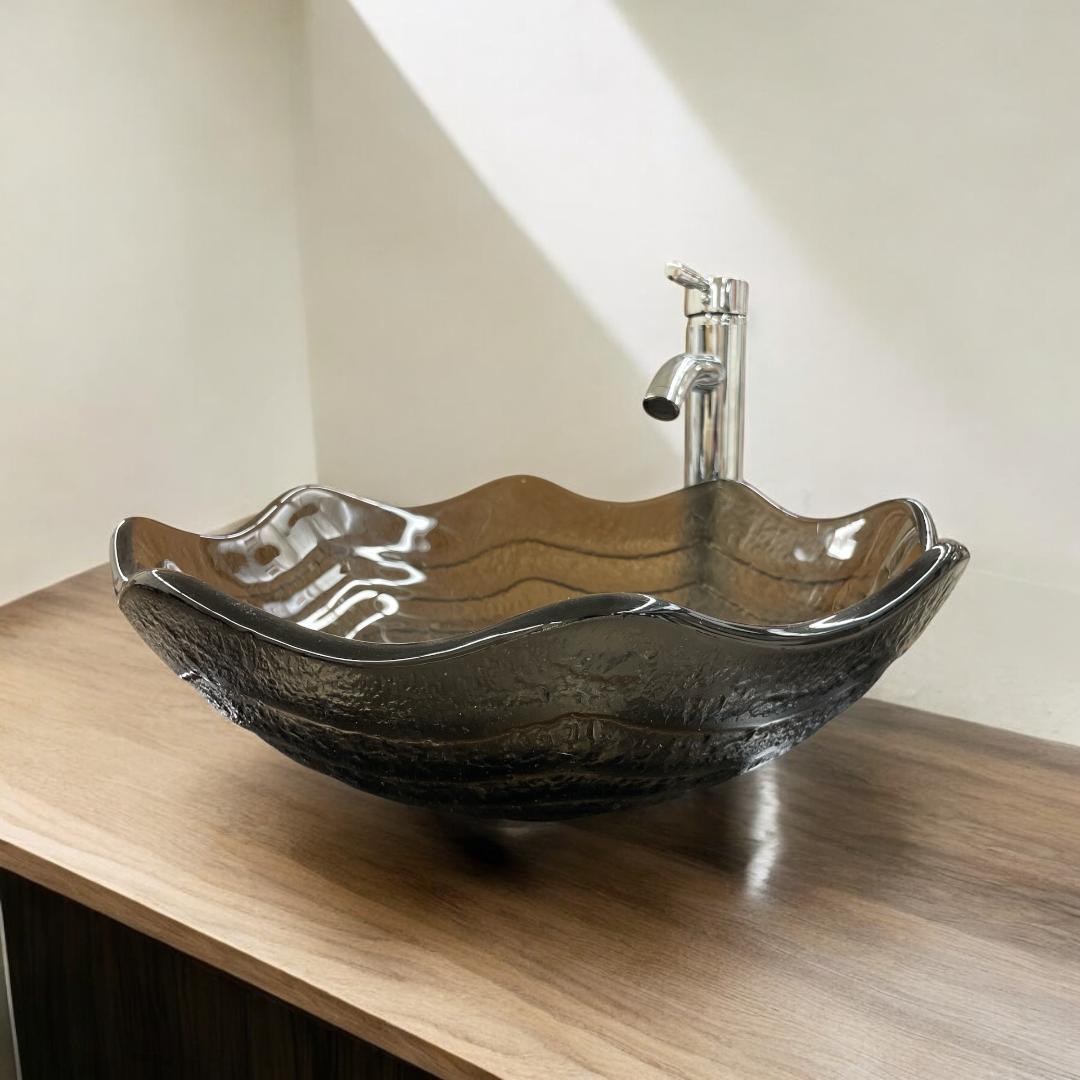 - Unique Modern Dark Brown Tempered Glass Vessel Sink Round Bowl Wave pattern Abov