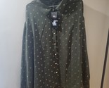 This green and gold button up top is still brand new with tags. Pit to pit is approx 26". 100% polyester. A14