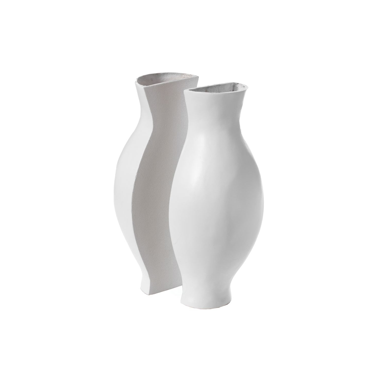 Welcome contemporary style into your home. This uniquely split shaped fiberglass vase will invite fresh vibes to any room placed for its sleek composition and distinct design. Group the 2 vases together or place one vase flat against the wall for a divided look, the possibilities are endless. Whether there is an empty area in need of a centerpiece or looking to lighten living space ambiance, this vase will add decorative appeal to your room decor. Fill it up with birch branches, your choice of flowers, or use alone as a burst of modern inspiration.
