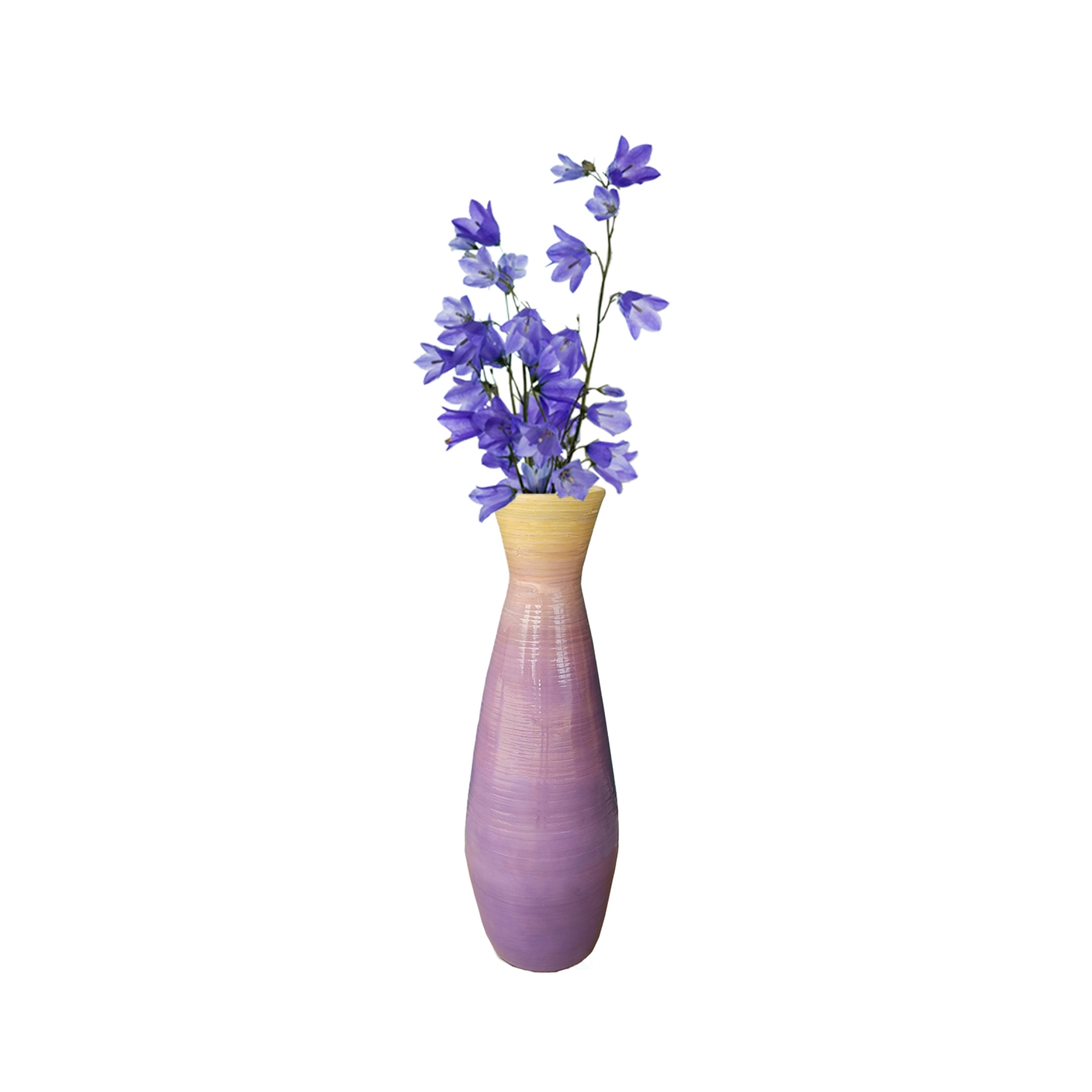 Features Crafted from natural bamboo Adds an elegant touch and a beautiful artistic design Crafted with a sturdy bamboo 100% natural material Suitable for dried branches, tall wispy grass, silk decorative flowers Specifications Color: Purple Material: Bamboo Shape: Trumpet Size: 31.5 x 10.25 Weight: 6 lbs