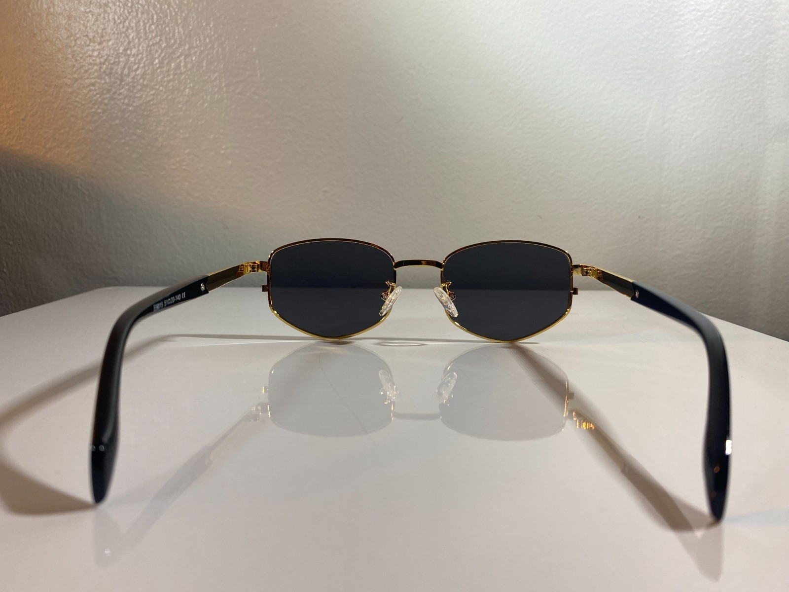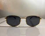 - Unisex, gold wire framed sunglasses with black accents and black lenses.