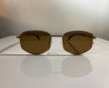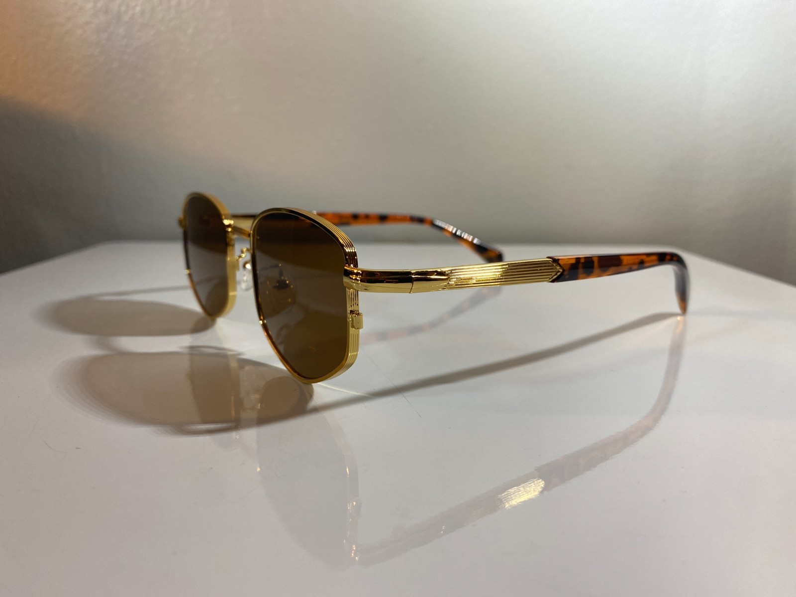 - Unisex, gold wire framed sunglasses with tortoise shell accents & brown lenses.