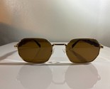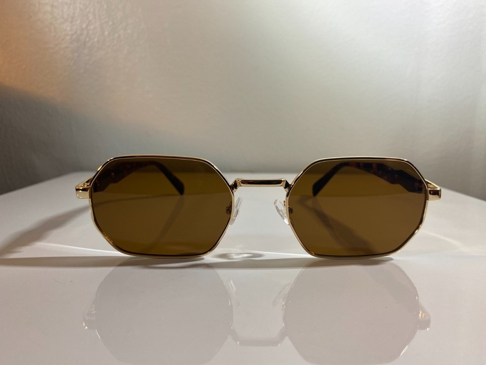 - Unisex, oval shaped sunglasses with brown lenses and gold wire frame.