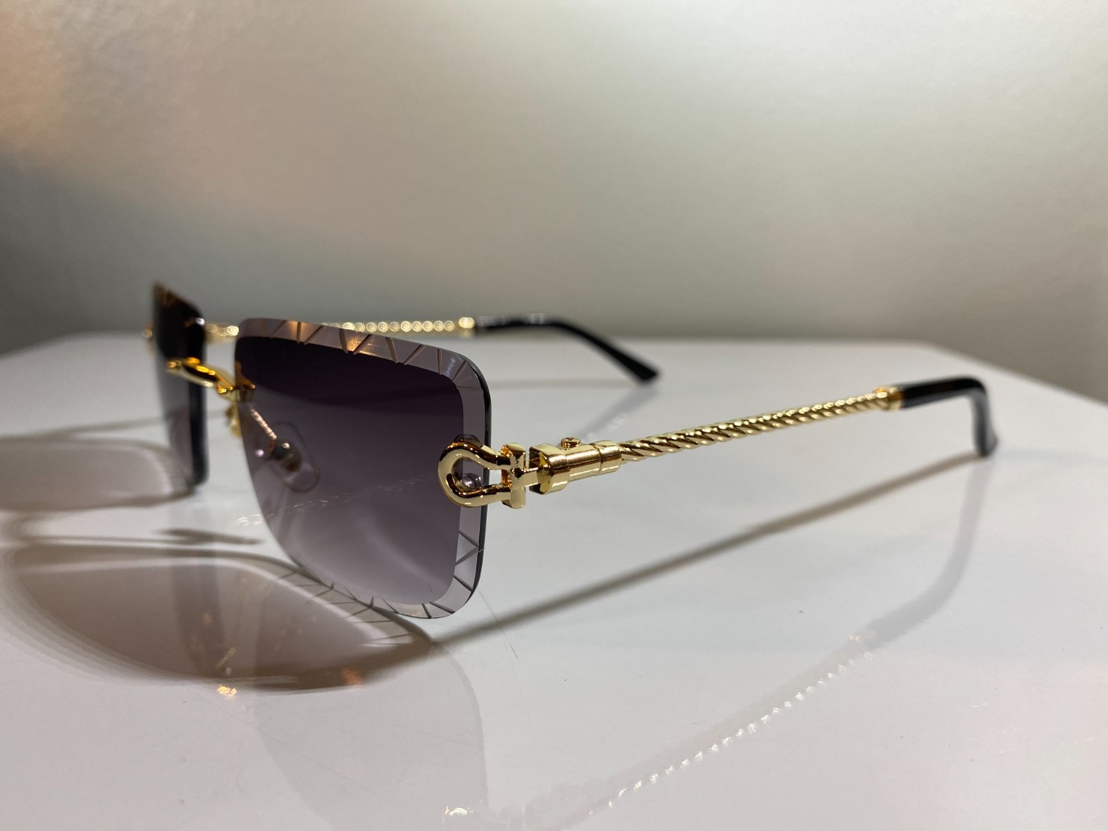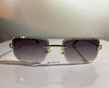 - Unisex, rimless, gem cut sunglasses with purple lenses and gold wire frame.