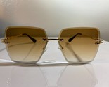 - Unisex, rimless, oversized sunglasses with brown lenses and gold wire frame.