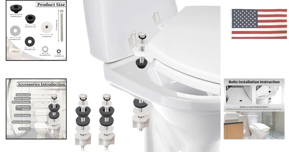 Universal Toilet Seat Hinge Bolts Kit, Heavy-Duty 3.3-In Stainless Steel Bolts with Rubber Washers and Extra-Long White Lock Nuts, Silver, 2-Pack ? ? ? ? ? ? ? ? ? ? ? ? ? ? ? ? ? ? Universal Toilet Seat Hinge Bolts Kit -Heavy-Duty 3.3-Inch Stainless Steel Bolts with Rubber Washers and Extra-Long White Lock Nuts -2-Pack Features: Made from stainless steel for durability and reliability. Anti-corrosion and anti-rust properties ensure longevity. Includes robust black rubber gaskets that are waterproof. Designed to fit most standard toilets with ease. Extra-long lock nuts provide stability, preventing sliding or shifting. Conveniently easy installation process with basic tools. Benefits: Enjoy a stable toilet seat that enhances your comfort during use. Quick installation saves you time and effort. High-quality materials are designed to last, reducing maintenance needs. Improved experience during everyday routines enhances happiness at home. Why Choose Our Toilet Seat Hinge Bolts Kit? Upgrade your bathroom experience with our Universal Toilet Seat Hinge Bolts Kit. Crafted from heavy-duty stainless steel, these bolts and accessories are not only tough but also resistant to corrosion and rust. Designed for easy installation, you'll find it straightforward to replace broken parts, allowing you to quickly restore your toilet seat's functionality and comfort. With an excellent array of components, including waterproof rubber washers and lock nuts to prevent movement, our kit ensures that your toilet seat remains stable and secure. Take the stress out of bathroom repairs and bring convenience back to your daily life. Order your 2-Pack today and experience the difference in quality and reliability! Shipping Free Fast Shipping - We offer free shipping to most of the USA with a normal delivery time of 3-7 days. However, due to the current situation, additional delivery time (up to 3 weeks) may be required for some items. Alternative Carriers - We may use alternative carriers (e.g. USPS, FedEx, UPS, etc.) to ensure your package arrives safely and on time. Due to the use of multiple carriers, we are unable to provide a tracking number automatically. Handling Time - Orders are processed and shipped within 1-2 business days of receiving cleared payment. Shipping Restrictions - Shipping to Alaska, Hawaii, Puerto Rico, Guam, and other US territories may incur shipping charges or delivery restrictions. Please contact us before ordering, or your order can be refunded/cancelled. State Restrictions - There may be restrictions based on your state of purchase. For example, certain items may not be shipped to California due to state regulations. Contact for Tracking Updates - If you require tracking updates or have any concerns about the delivery of your order, please feel free to contact us, and we will be happy to assist you. Return 30-Day Hassle-Free Returns - We want you to be completely satisfied with your purchase. If you are not, you can return the item within 30 days of receiving it for a full refund or exchange. Easy Return Process - To start a return, simply contact us and we will provide you with a prepaid return shipping label and detailed instructions. Restocking Fee - There are no restocking fees for returns. However, the buyer is responsible for return shipping costs if the return is not due to a seller's error. Refund Processing Time - Refunds will be processed within 5 business days of receiving the returned item in its condition. Payment We accept all major credit cards, PayPal, and Apple Pay for your convenience. Your payment information is secure and encrypted to ensure a safe and seamless transaction. Please complete your payment within 3 days of purchase to avoid any delays in shipping. Feedback Your feedback is extremely important to us. We strive to provide the best products and customer service possible. If you are satisfied with your purchase, please take a moment to leave us a positive review. If you have any concerns or issues with your order, please contact us before leaving negative feedback. We are committed to resolving any problems and ensuring your satisfaction. Contact Us If you have any questions or concerns, please feel free to out to our customer support team. You can contact us through the messaging system. We are available Monday to Friday, 9:00 am to 5:00 pm EST, and we will do our best to respond to your inquiry within 24 hours. Buy it now and enjoy a pleasant shopping experience! UPC: 772195460470 Unit Quantity: 2 Is Discontinued By Manufacturer: No Material: Plastic Features: Does not apply,Anti-Corrosion,Anti-Rust,Waterproof,Durable,Easy to Install MPN: Does not apply Color: Silver Item Weight: 2.29 ounces