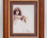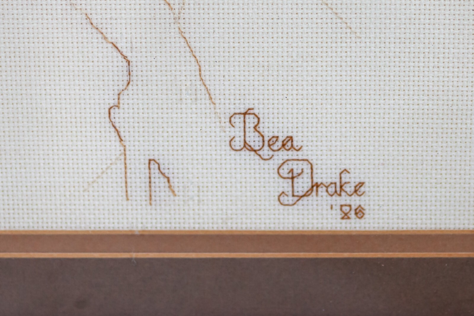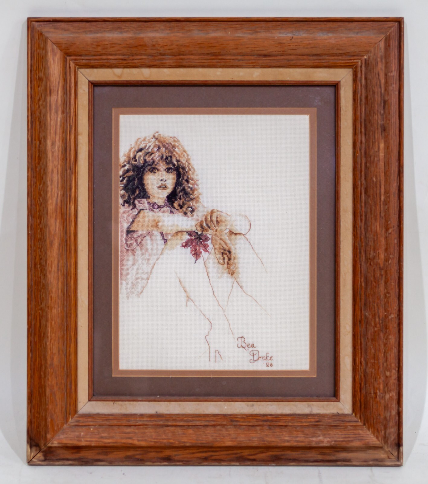 Untitled Sepia Toned Embroidery Cross-Stitch of Woman Signed Bea Drake 1986