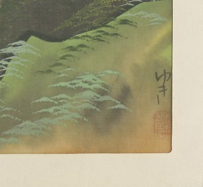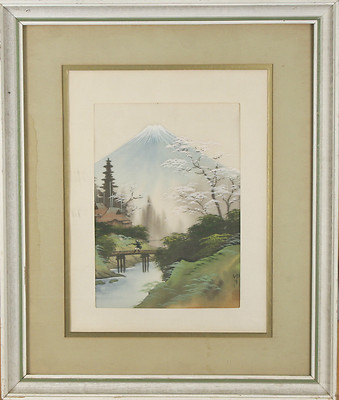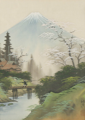 Untitled (Vintage Japonais Mt.Fuji ) Peinture Signée & Tamponné Sur Soie 19 "