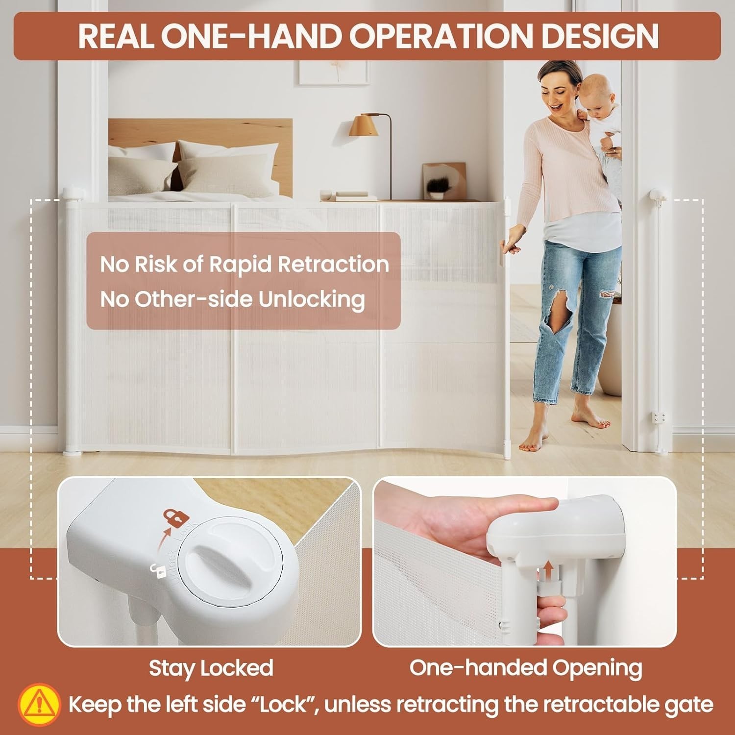 Real One-handed Operation Design --- When going through retractable baby gates extra wide, Left side stay ?Lock?, then press button on the right firmly with one hand to open retractable baby gate, Avoiding risk of baby gate retracting quickly, and no need to put up with hassle of left and right operation of old-fashioned retractable dog gate. Convenience safety. Important Tips: Keep the left side ?Lock? when using the outdoor retractable gate