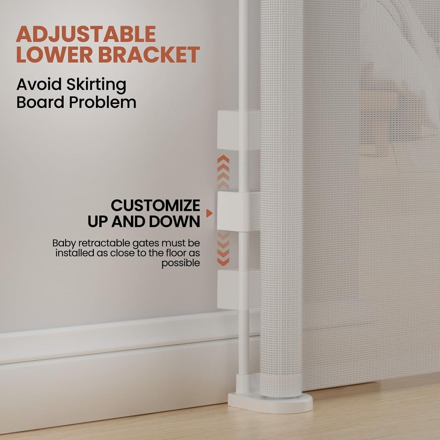 Easy to Install Retractable Outdoor Gate --- Adjustable lower bracket on 150? extra wide retractable baby gates to avoid skirting board problem. Child safety gate fit any baseboard and are easy to install without shims required. No need to measure, the rod will help you find the exact location of the hole punch directly. Retractable safety gate supports hardware mounted(need to be drilled). Warning: Retractable gates cannot be installed on drywall and glass doors