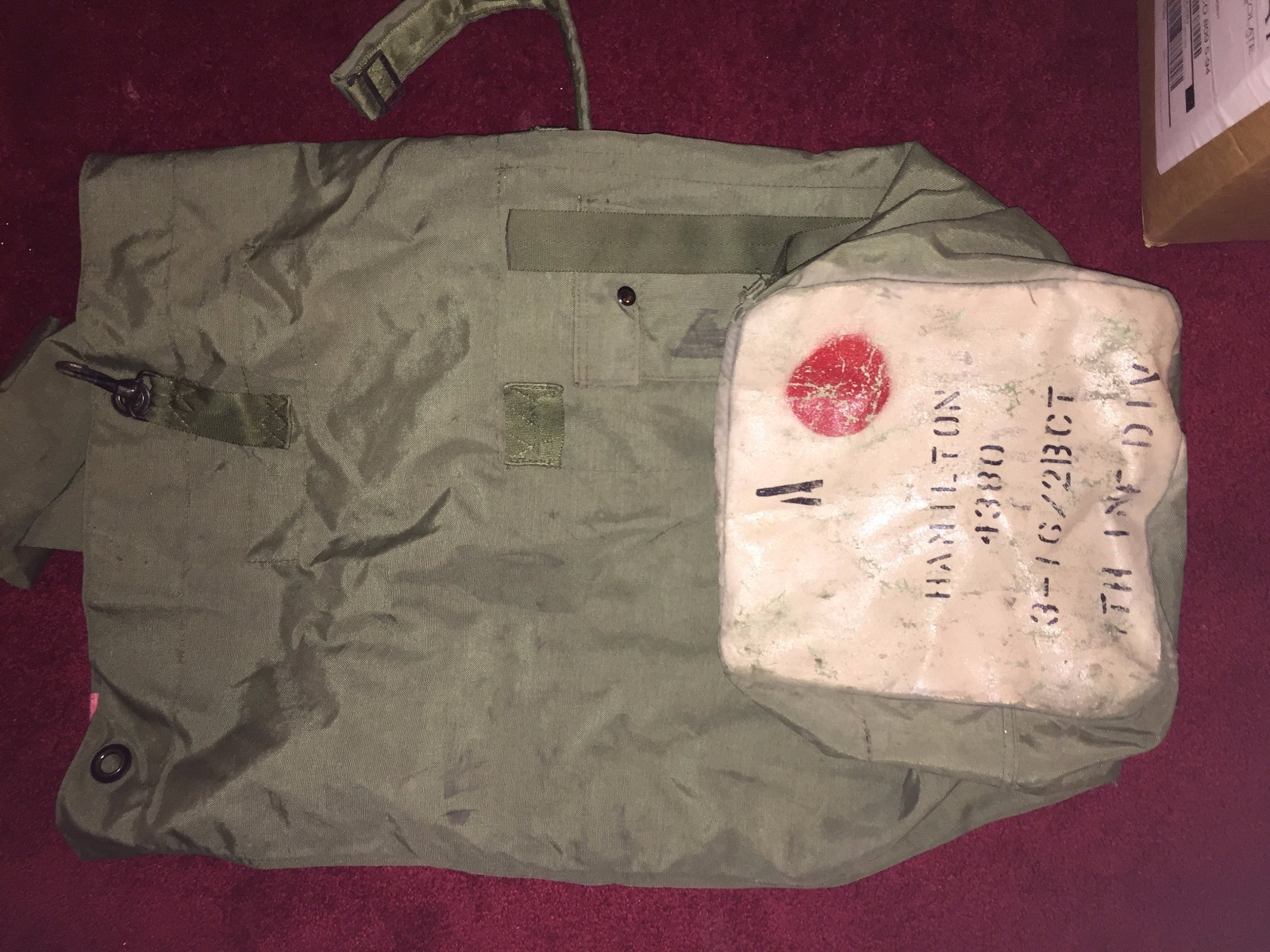 US Military Nylon Duffel Camping Bag Used w/ Unit logo ARMY USMC OD GREEN