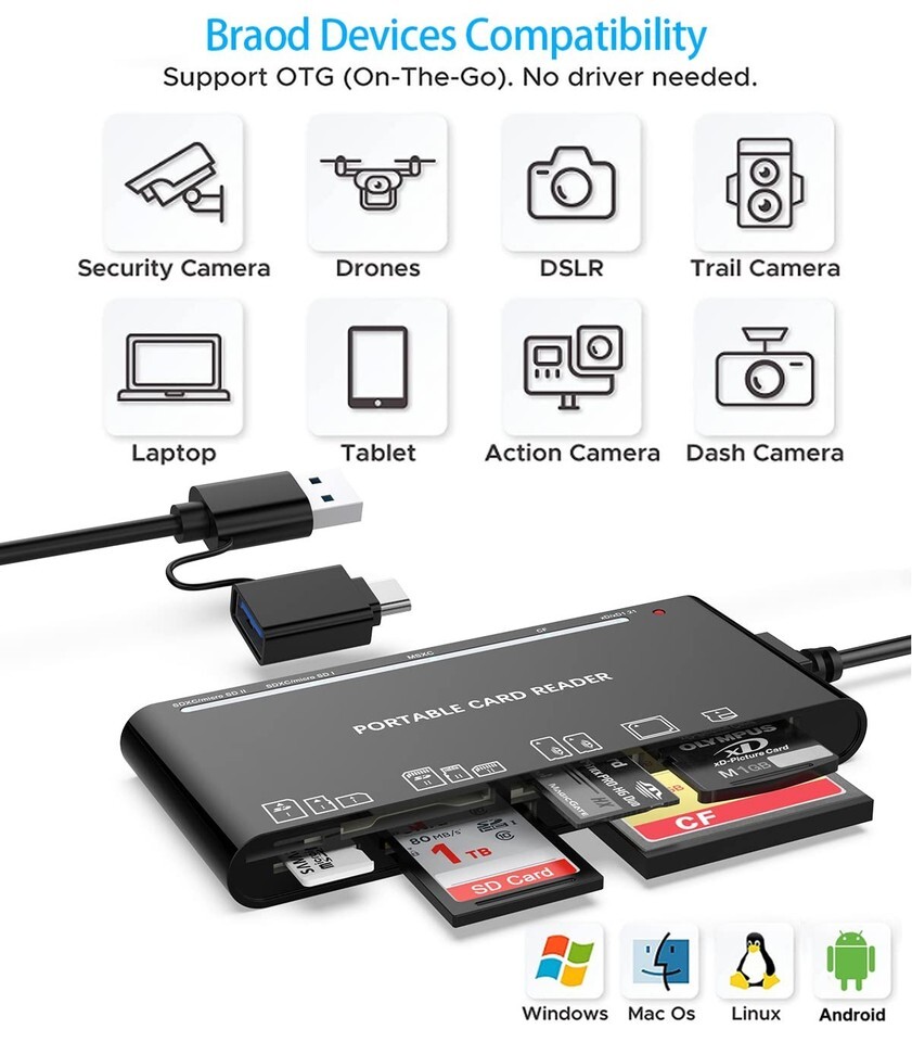 ?Broad Card Compatibility?This USB C and USB3.0 multi card reader supports SD card: SDXC / SDHC / SD / Extreme III SD I / Ultra II SD / MMC (mini SD / Mini SDHC / RS-MMC / HS RS MMC may need an adapter) * CF Slot: CF I 3.0 4.0 / EXTREME I III CF / ULTRA II CF / CF SA / XS XS-CF / CF Elite Pro / CF PRO / CF PRO II * Micro SD (T-flash) Slot: Micro SDXC / SDHC micro / Micro SD * EM / MS Pro / MS Pro Duo / MS Pro MG / MS MG PRO Duo / HS MS Pro Duo MG / MS Pro Duo * XD / xD1.21.