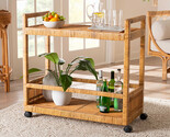 Add a touch of exotic personality to your space while accommodating your needs with the lovely Dorthy kitchen cart. Made in Indonesia, this bohemian piece consists of a sturdy wood frame wrapped in handwoven rattan. Two tiers of slatted rattan shelves offer plentiful space to organize a variety of essentials, while the bold silhouette of the frame lends crisp geometric flair. The Dorthy will arrive fully assembled and utilizes caster wheels for convenient mobility. Brandishing ergonomic design with vibrant style, the Dorthy kitchen cart is sure to uplift any arrangement.